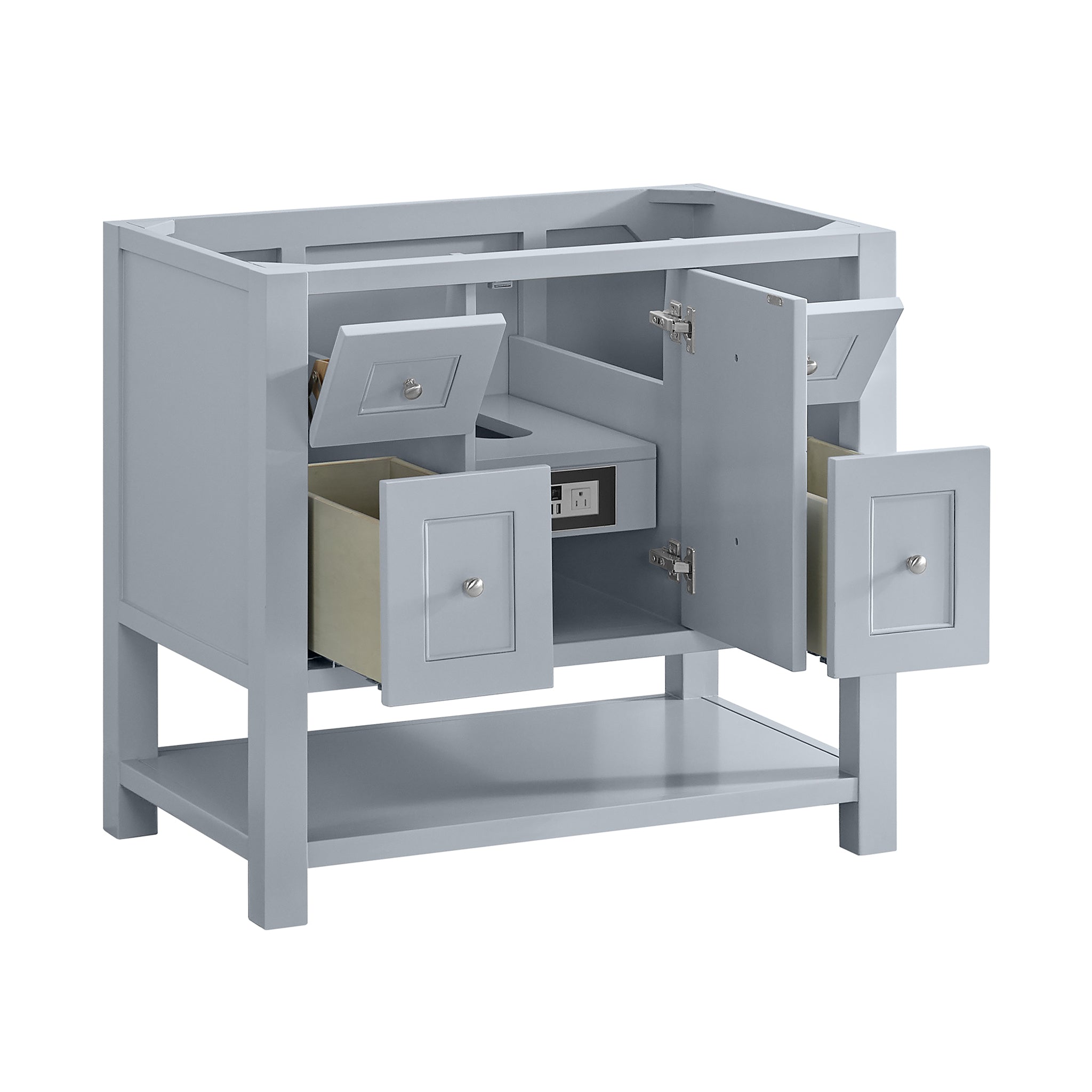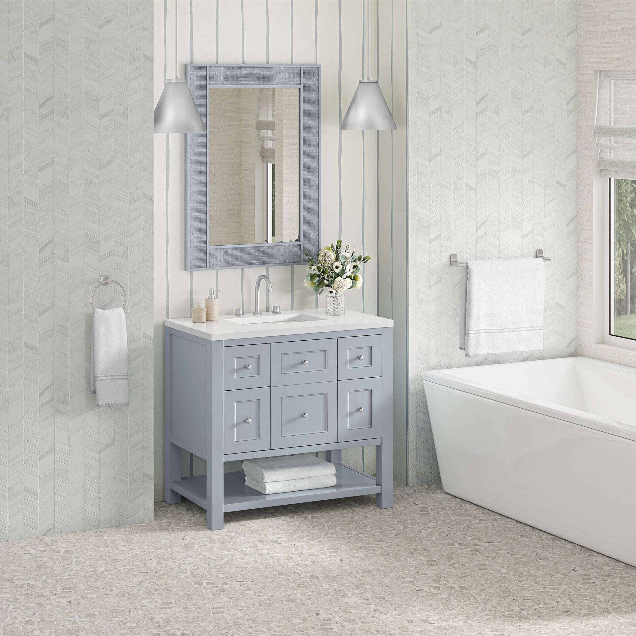 The Breckenridge 36" Single Vanity by James Martin Vanities is a fresh take on traditional Mission furniture that easily transitions to Modern Farmhouse style with an air of understated sophistication. Satin Nickel knobs complement the Serenity Blue finish, while the neatly inset door and drawer fronts lend a fresh appeal to this clean-lined classic. A single-door cabinet opens to reveal an interior shelf equipped with convenient built-in USB/120V power outlet. This console-style vanity also features two top-row tip-out drawers, two standard full-extension drawers, and an open lower shelf for additional storage. A classic White Zeus Silestone® top with undermount sink completes the look.