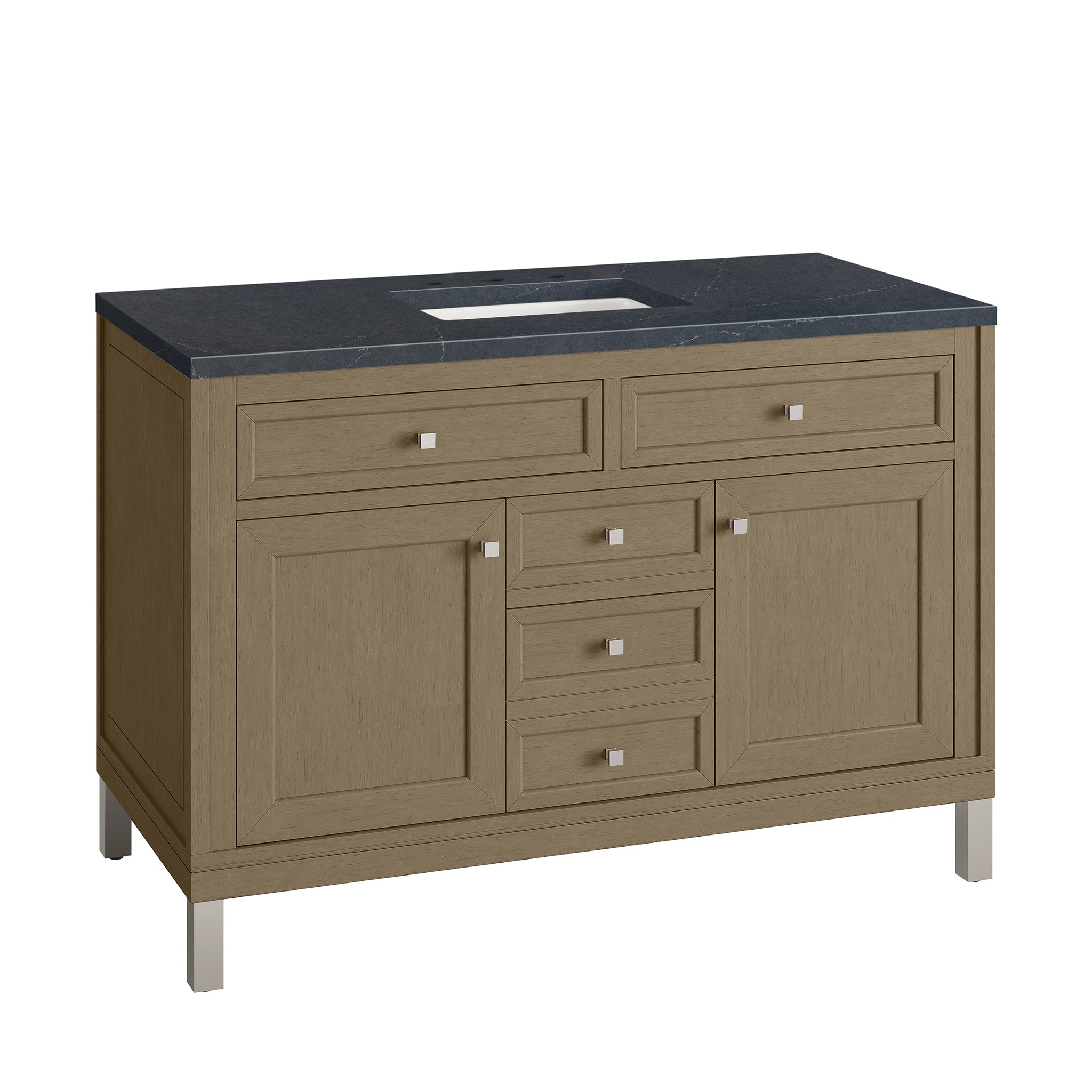 The sophisticated details and clean lines of the Chicago 48" Single Vanity by James Martin Vanities make it the perfect choice for any bathroom. Featuring a Walnut Whisper finish, this vanity offers ample storage with its two single-door cabinets, adjustable interior shelves, and four drawers (three standard; one double-deep). Brushed Nickel knobs and legs add a contemporary touch; or choose to forego the metal legs for a modern wall-mounted installation. A classic Charcoal Soapstone Silestone® top with undermount sink completes the look.