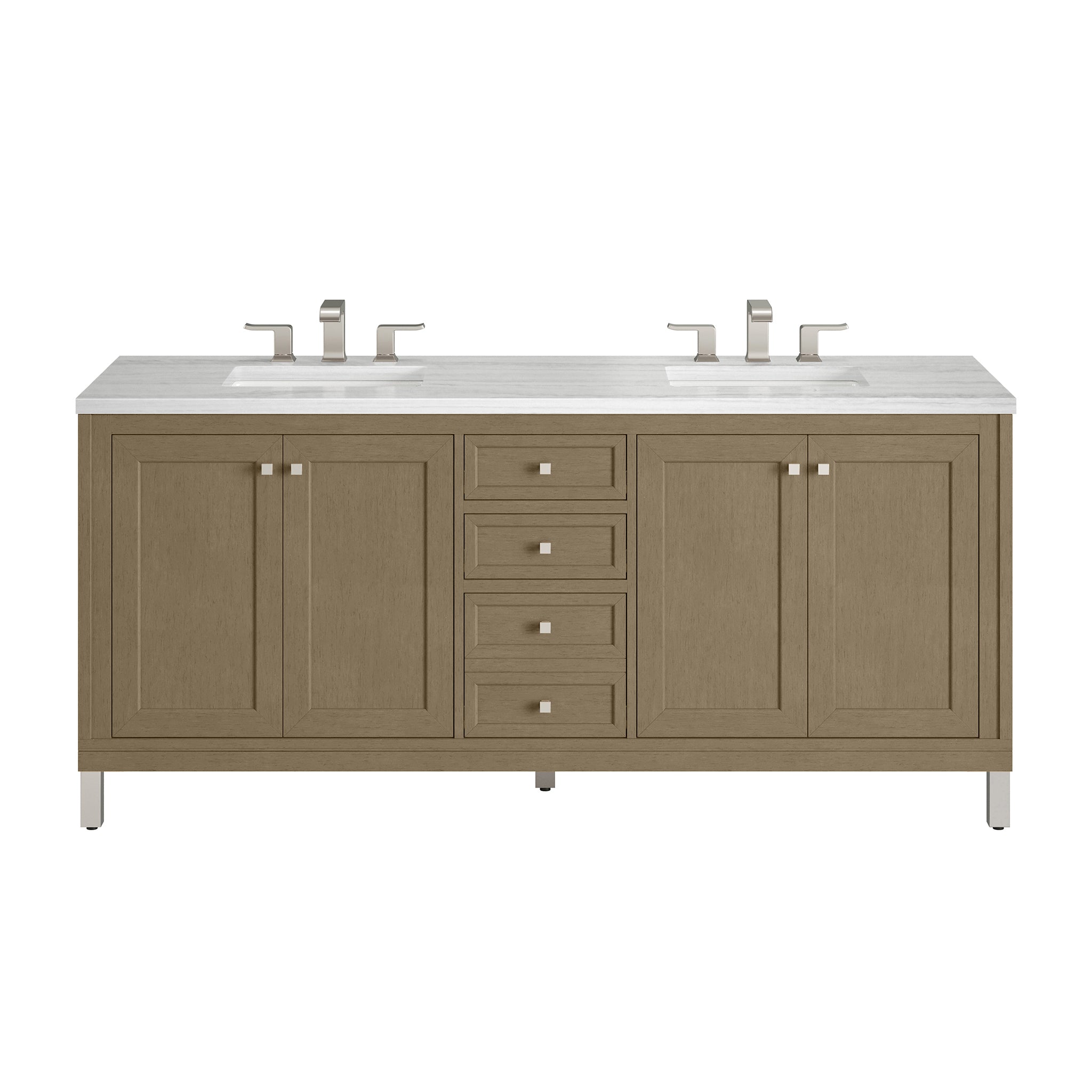 The sophisticated details and clean lines of the Chicago 72" Double Vanity by James Martin Vanities make it the perfect choice for any bathroom. Featuring a Walnut Whisper finish, this vanity offers ample storage with its two double-door cabinets, adjustable interior shelves, and three drawers (two standard; one double-deep). Brushed Nickel knobs and legs add a contemporary touch; or choose to forego the metal legs for a modern wall-mounted installation. The addition of a modern Arctic Fall Solid Surface top with undermount sinks completes the look.