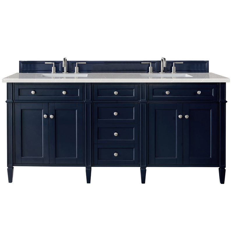 • 60" Brittany Double Bathroom Vanity, Victory Blue: This stylish vanity fits easily into a traditional primary bathroom, as it does in a transitional bathroom. Its Victory Blue finish is striking, beautifully offset with Satin Nickel finished hardware accents. The tapered legs add an extra element of finely crafted design details. Six drawers and two large cabinet doors easily handle all your accessories. Pair this blue vanity with a mirror to complete your bathroom.