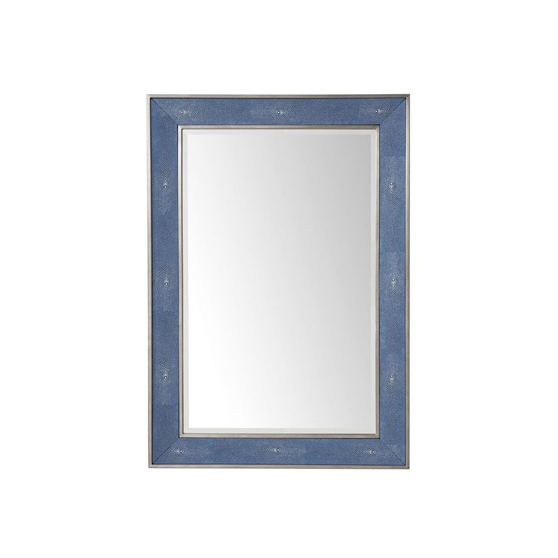 • 30" Tangent Mirror, Silver with Delft Blue: Showcase your refined sense of style with this premium blue bathroom mirror. Hang vertically for a more traditional configuration, or go with a horizontal mount – perfect above a double vanity in your primary bathroom. This stunning mirror also excels as a stand-alone wall accent on an adjacent or opposite wall from your vanity. The iron-accent border details pair perfectly with the mirror’s blue faux shagreen construction.