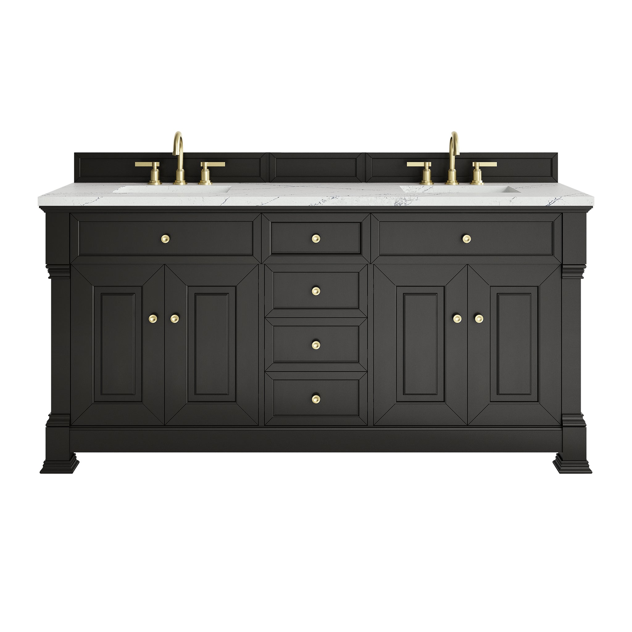 The Brookfield 72" Double Vanity in Black Onyx by James Martin Vanities offers a blend of traditional elegance and contemporary sophistication. The raised panel picture frame doors and detailed corner molding reflect timeless craftsmanship, while the rich Black Onyx finish and Champagne Brass hardware lend a fresh, modern appeal. This beautifully crafted vanity features two double-door cabinets that open to interior shelves, along with four standard drawers for ample storage. The timeless Black Onyx finish lends sophistication and charm to your space, while the addition of an Ethereal Noctis top with white porcelain undermount sinks completes the look.