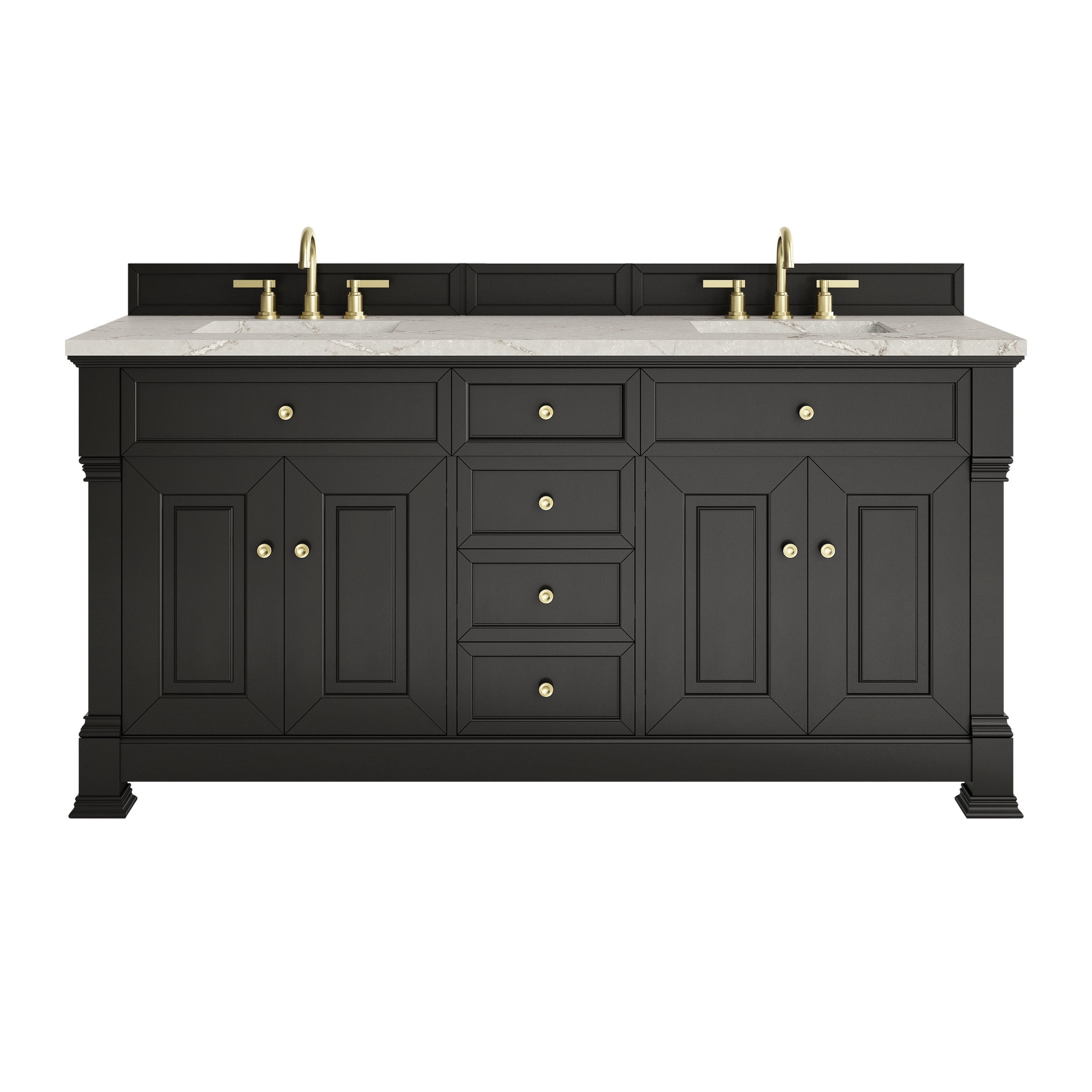 The Brookfield 72" Double Vanity in Black Onyx by James Martin Vanities offers a blend of traditional elegance and contemporary sophistication. The raised panel picture frame doors and detailed corner molding reflect timeless craftsmanship, while the rich Black Onyx finish and Champagne Brass hardware lend a fresh, modern appeal. This beautifully crafted vanity features two double-door cabinets that open to interior shelves, along with four standard drawers for ample storage. The timeless Black Onyx finish lends sophistication and charm to your space. The addition of a Victorian Silver Silestone® top featuring a neutral white and gray background with fine silver veining, along with an undermount sinks, completes the look.