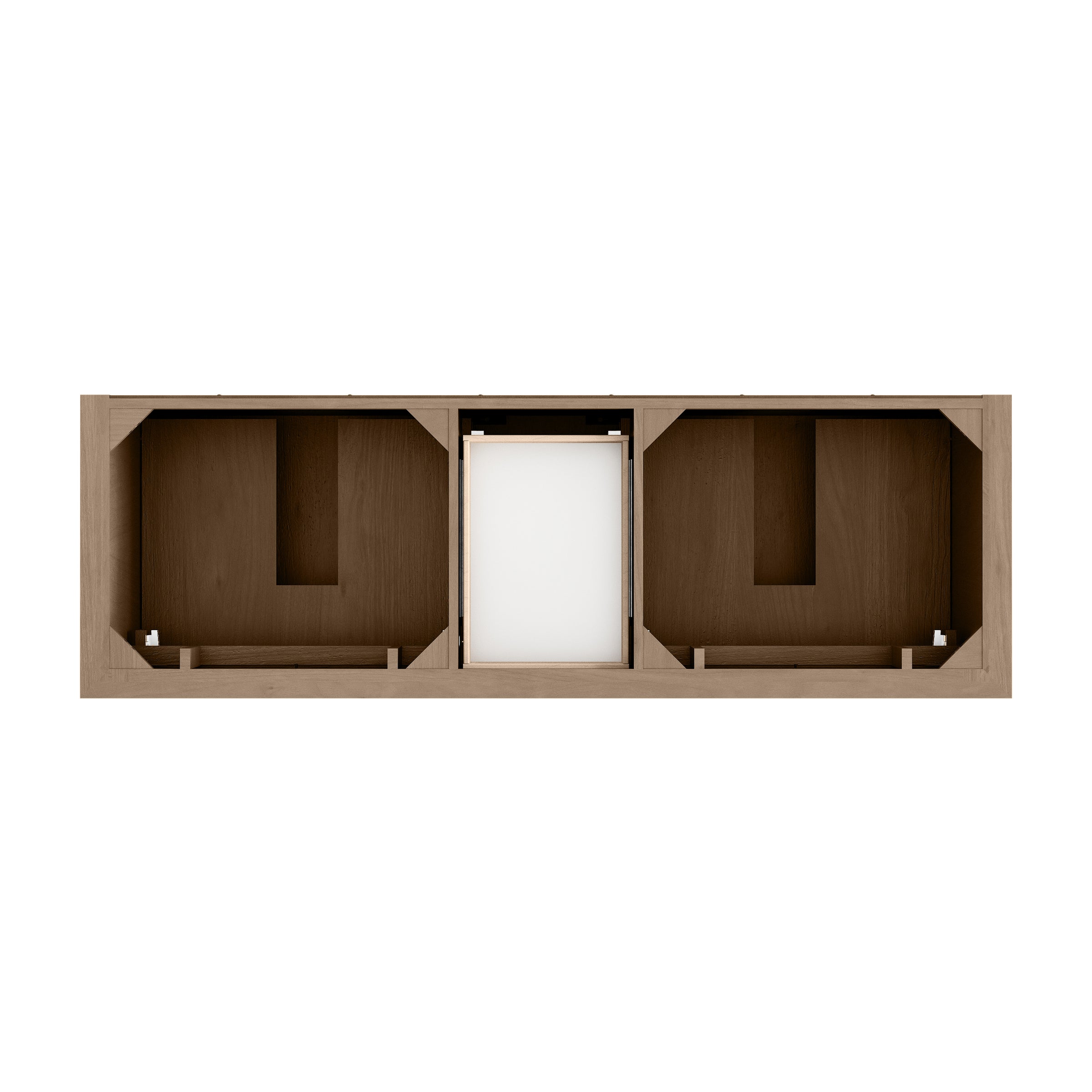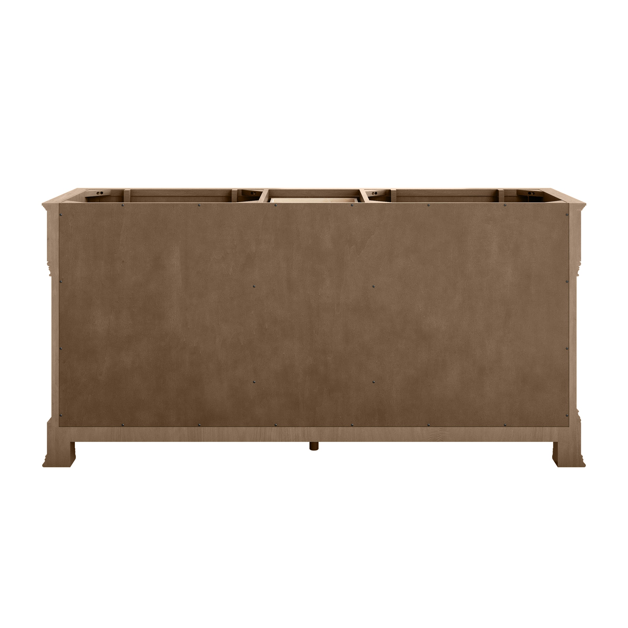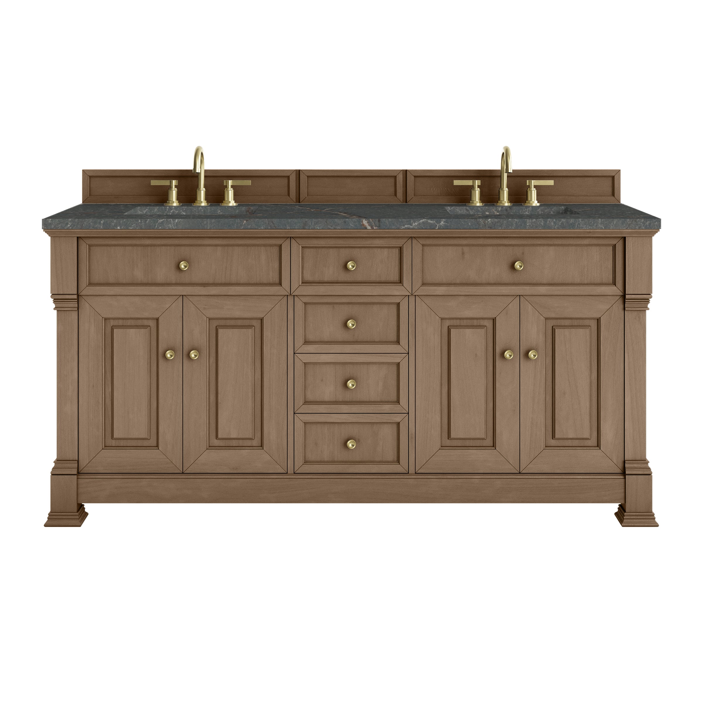 The Brookfield 72" Double Vanity in Pecan by James Martin Vanities offers a blend of traditional elegance and contemporary sophistication. The raised panel picture frame doors and detailed corner molding reflect timeless craftsmanship, while the Pecan finish and Champagne Brass hardware lend a fresh, modern appeal. This beautifully crafted vanity features two double-door cabinets that open to interior shelves, along with four standard drawers for ample storage. The cool wood tones highlight the natural Oak wood grains, lending sophistication and charm to your space. The addition of a Parisien Bleu Silestone® top featuring copper veining and an undermount sinks completes the look.