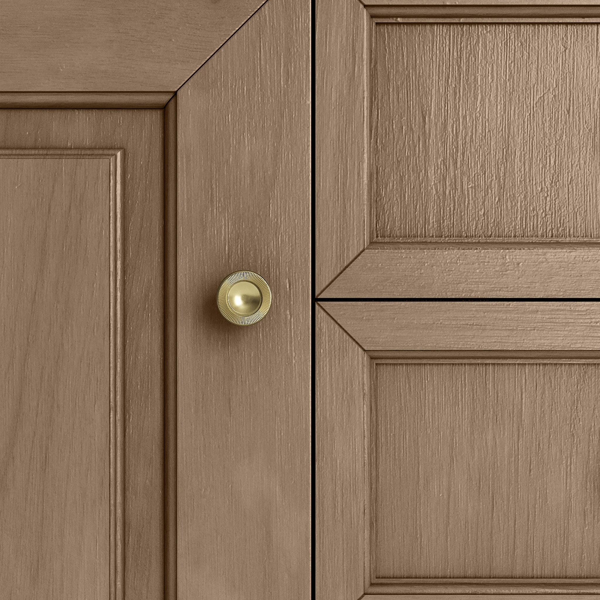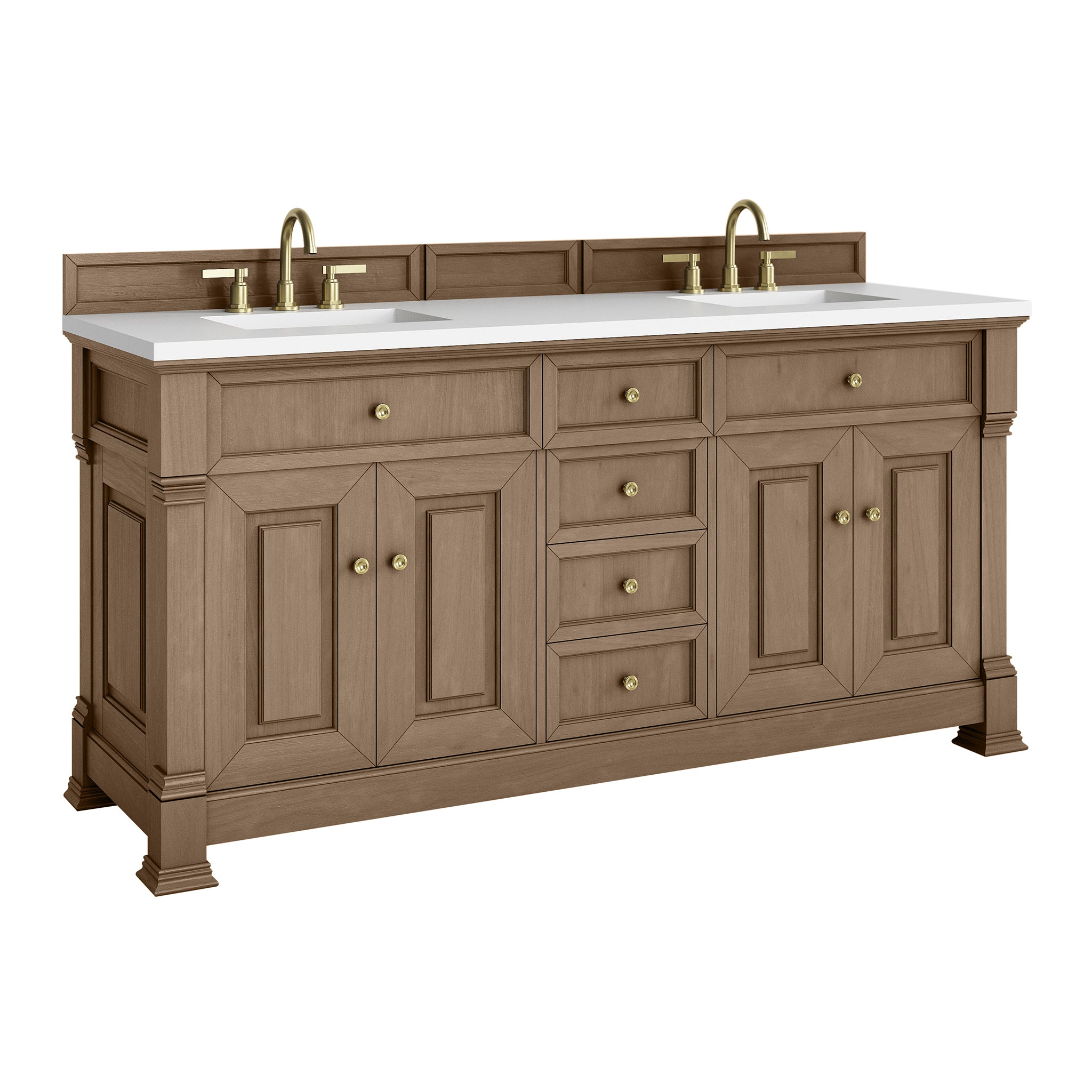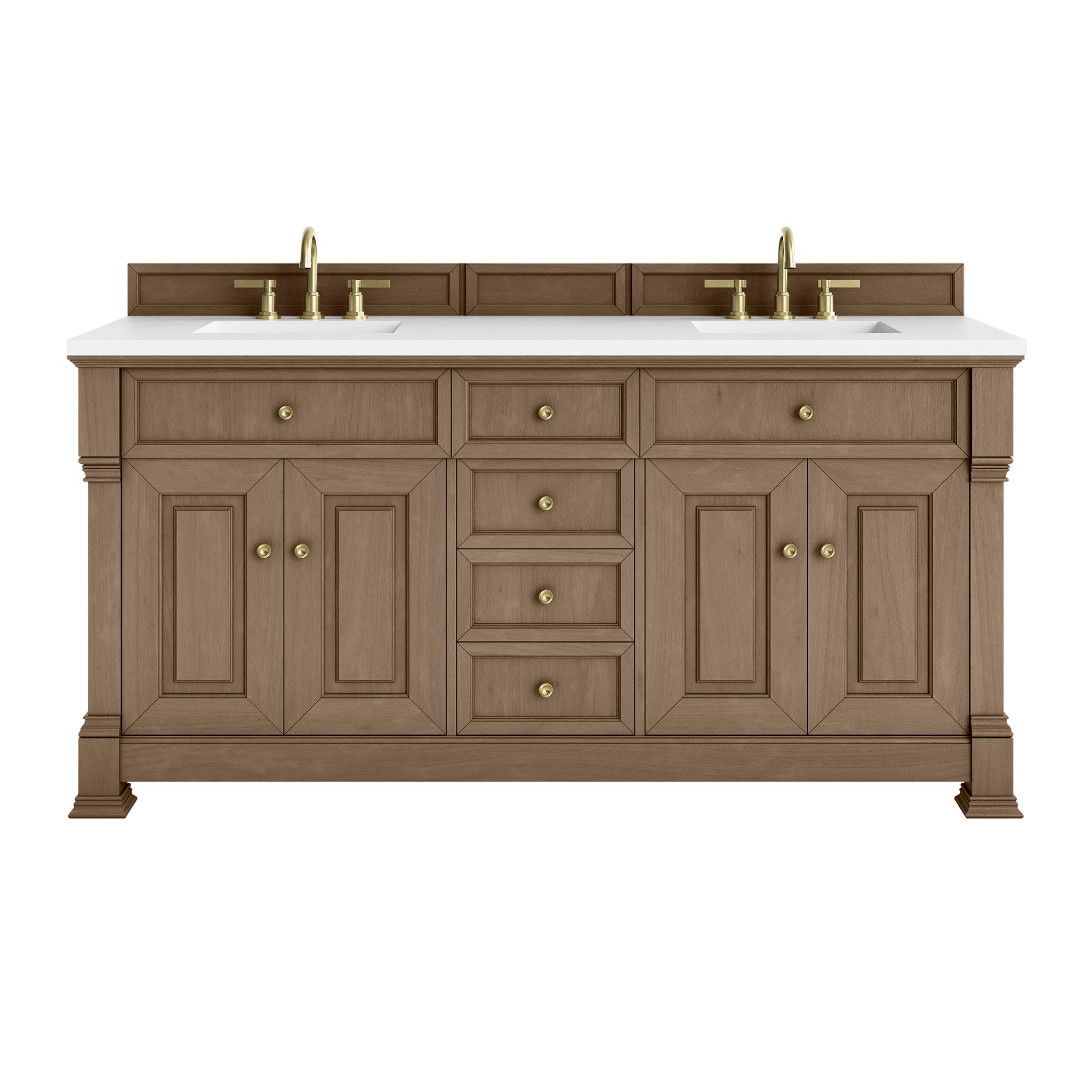 The Brookfield 72" Double Vanity in Pecan by James Martin Vanities offers a blend of traditional elegance and contemporary sophistication. The raised panel picture frame doors and detailed corner molding reflect timeless craftsmanship, while the Pecan finish and Champagne Brass hardware lend a fresh, modern appeal. This beautifully crafted vanity features two double-door cabinets that open to interior shelves, along with four standard drawers for ample storage. The cool wood tones highlight the natural Oak wood grains, lending sophistication and charm to your space. A classic White Zeus Silestone® top with undermount sinks completes the look.