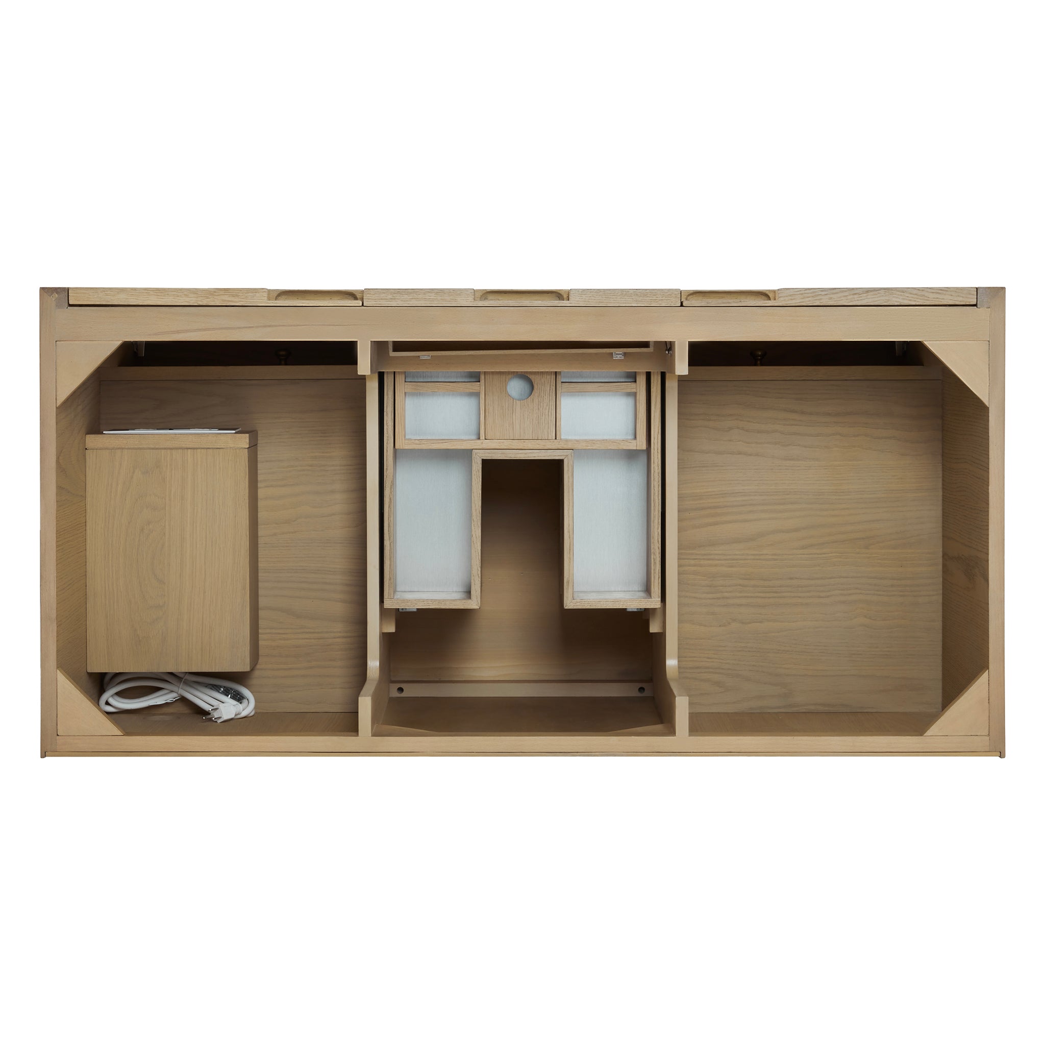The Solene 48" Single Vanity by James Martin Vanities elegantly weaves together a beautiful blend of natural materials. Framed in solid White Oak, the natural Cane detail and warm Seaside Oak finish make the Solene a stunning centerpiece for your bathroom. The subtle reverse-tapered legs and modern cutout cabinet pulls add visual intrigue to your space. Featuring an integrated USB/120V power unit and removable White Oak drawer organizer, this vanity offers ample storage with its two full-extension drawers, one tip-out drawer, and two single cabinets with interior shelving and two internal drawers, in addition to an open lower shelf. Completed with a warm Eternal Marfil Silestone® top and undermount sink, the Solene vanity will bring your bathroom to life with its blend of natural elements and contemporary aesthetic.