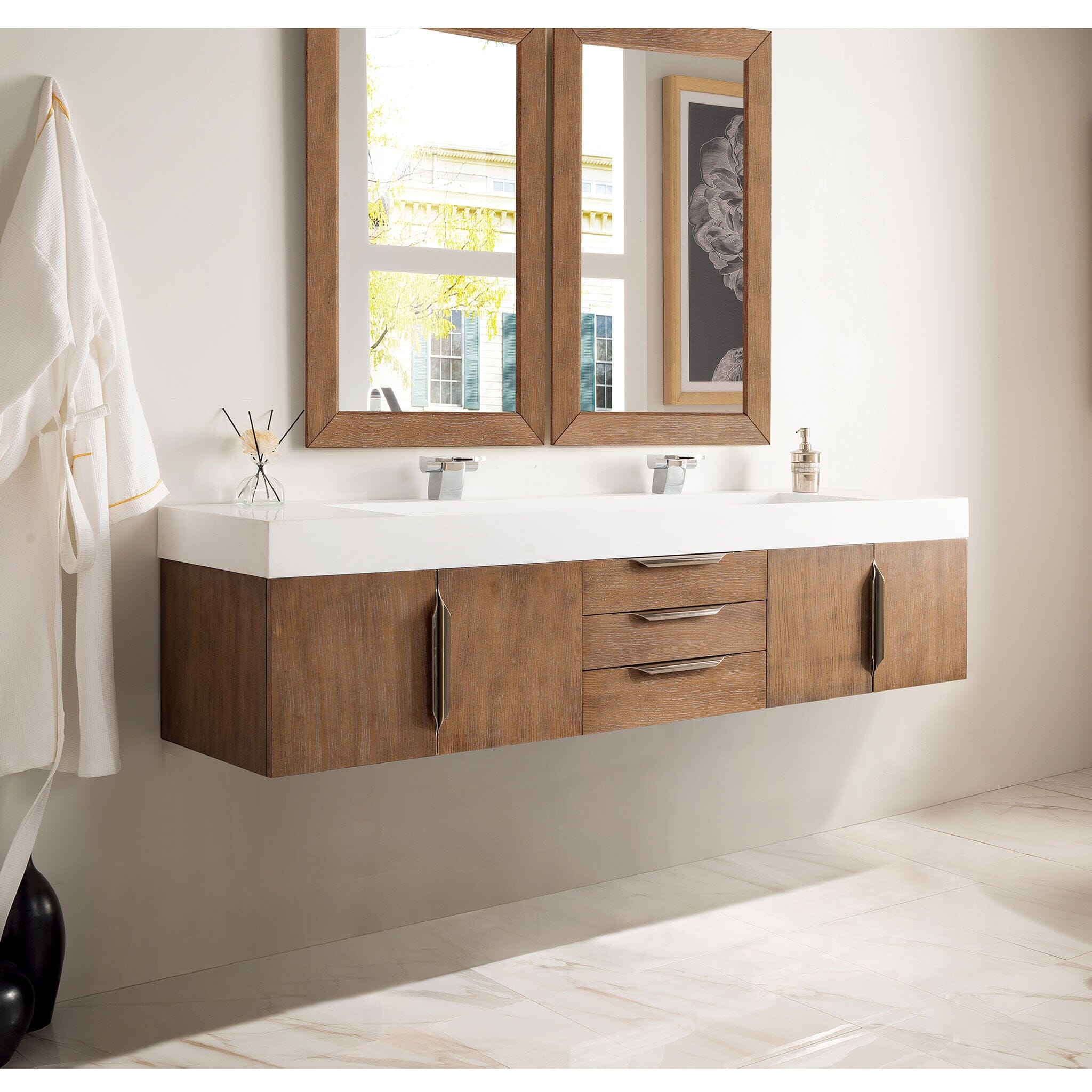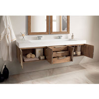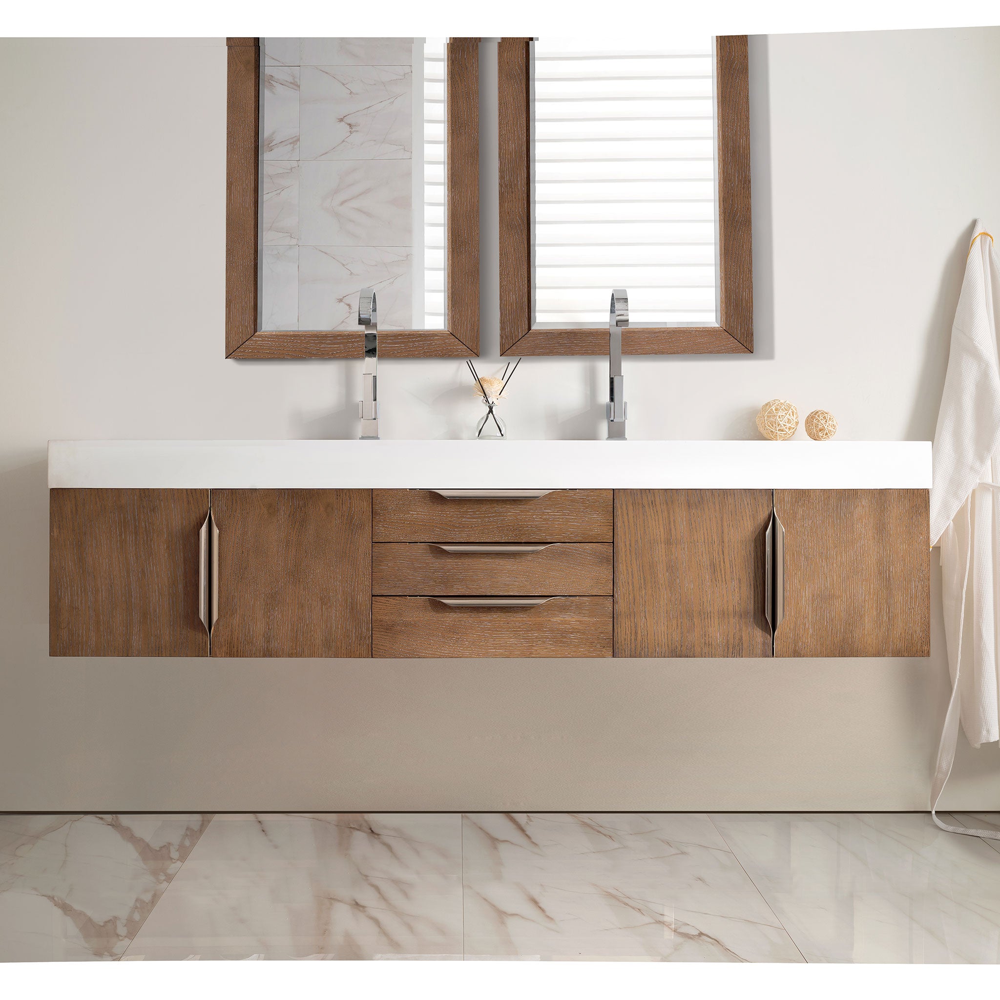 72" Columbia Floating Double Bathroom Vanity, Latte Oak and Glossy White Composite Stone Top