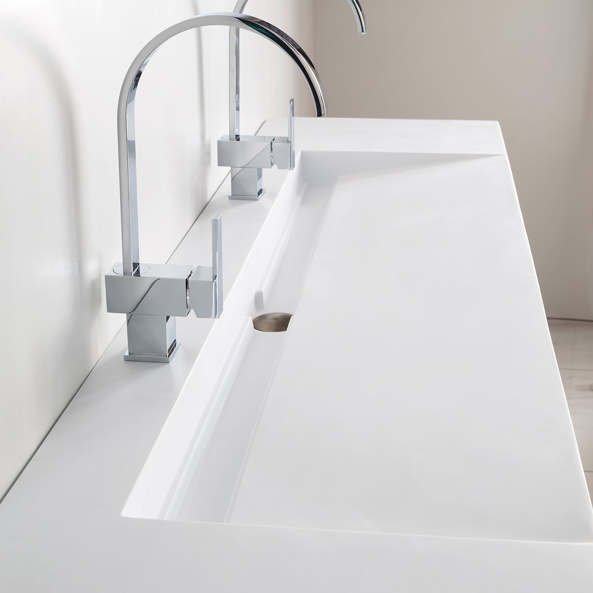 Integrated top and sink include stainless steel grate cover for drain Solid Surface countertops are resistant to staining, mildew and UV light