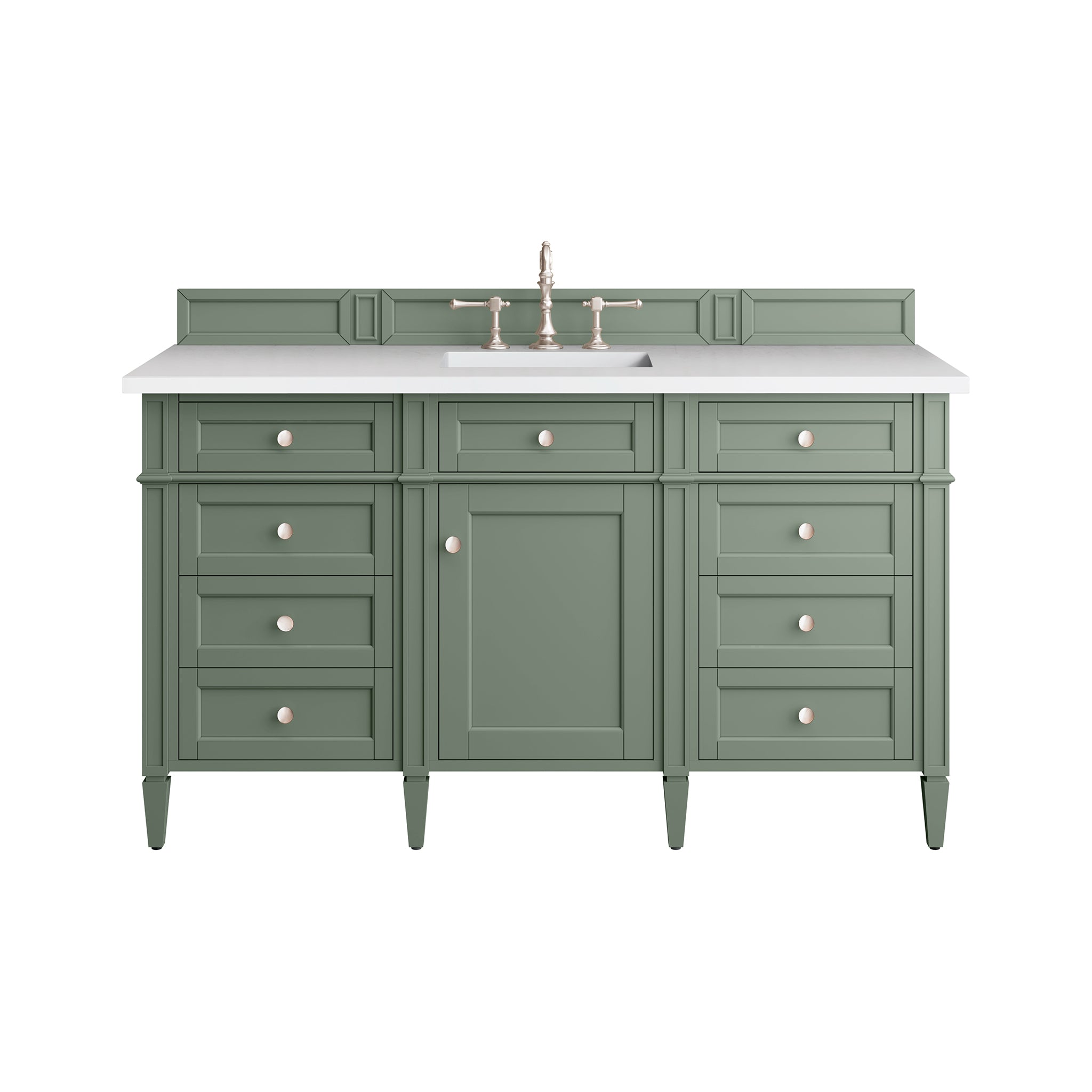 The Smokey Celadon finish on the 60" Brittany Vanity adds a refreshing, natural element to any bathroom space. This moody, yet muted green, with subtle blue and grey undertones, brings the rich, timeless details of the Brittany collection to life. The 60" cabinet, with decorative wood backsplash, features optimal organization with one hide-away tip-out drawer plus six side drawers, two of which are double height for storing taller items. This cabinet also has one door, which conceals an interior shelf. All drawers are lined with an aluminum laminate surface for easy cleaning and are equipped with undermount soft-close slides.