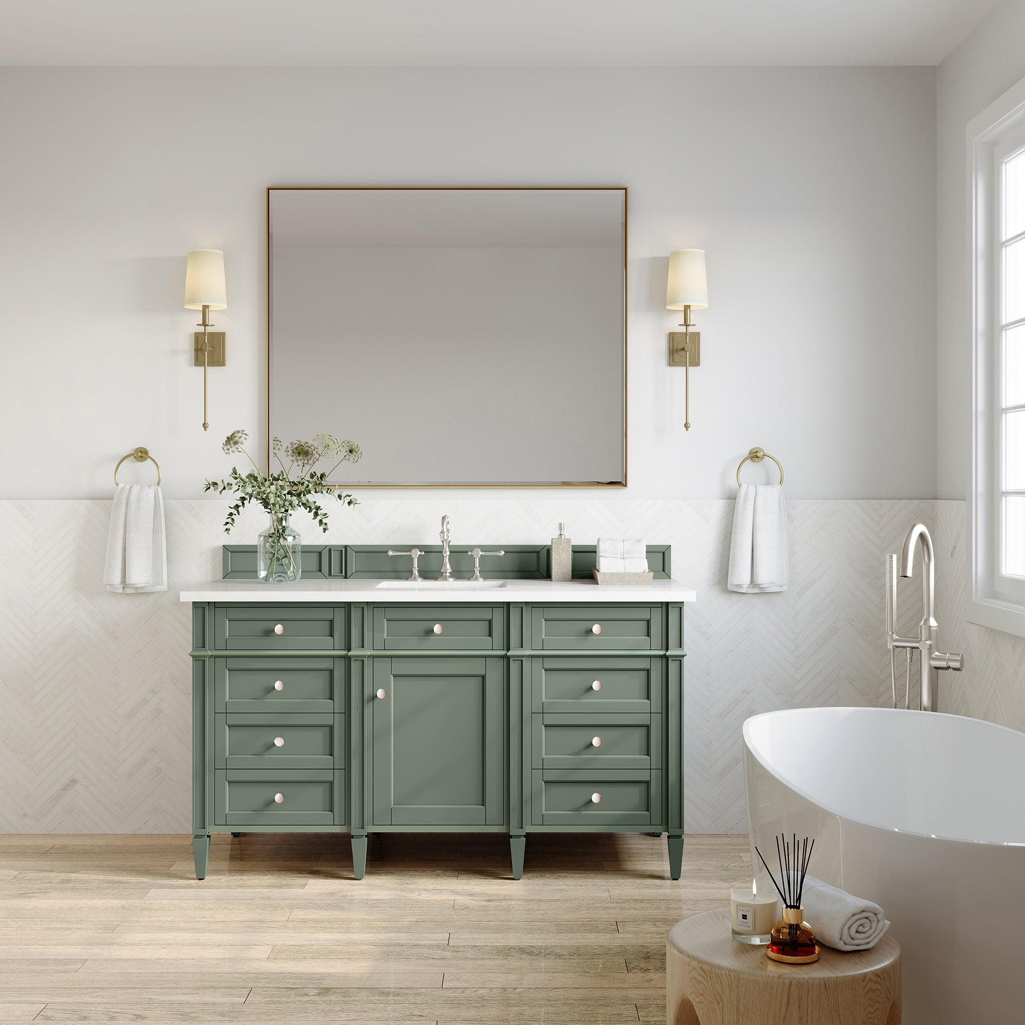 60" Brittany Single Bathroom Vanity, Smokey Celadon w/ White Zeus Quartz Top