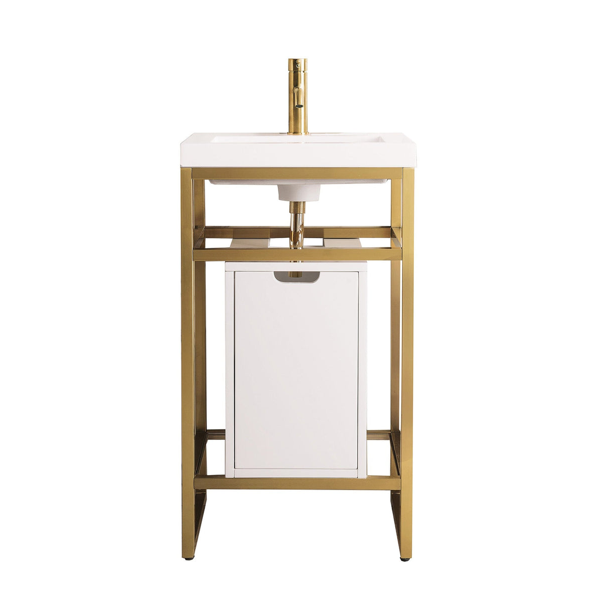 The Boston 20-in Stainless Steel Console by James Martin Vanities is a beautiful small space solution vanity that will work well in any powder room. This space-conscious console is crafted with a durable stainless-steel base with a radiant gold finish giving you the clean lines and an open view that will work well with a variety of different decors. This versatile cabinet comes with a white glossy polyester solid surface top with an integrated sink for a modern clean look that is predrilled for your convenience for a single hole faucet (not included with purchase). The modern designed storage cabinet below is the perfect place to stow extra towels or any other bathroom essential you may need.