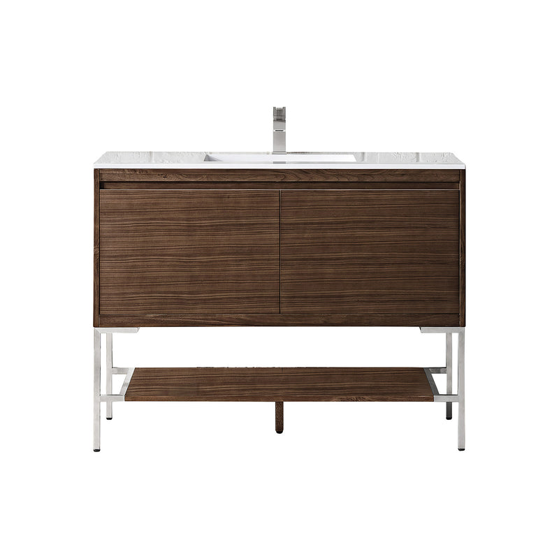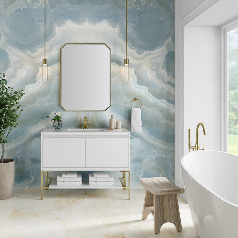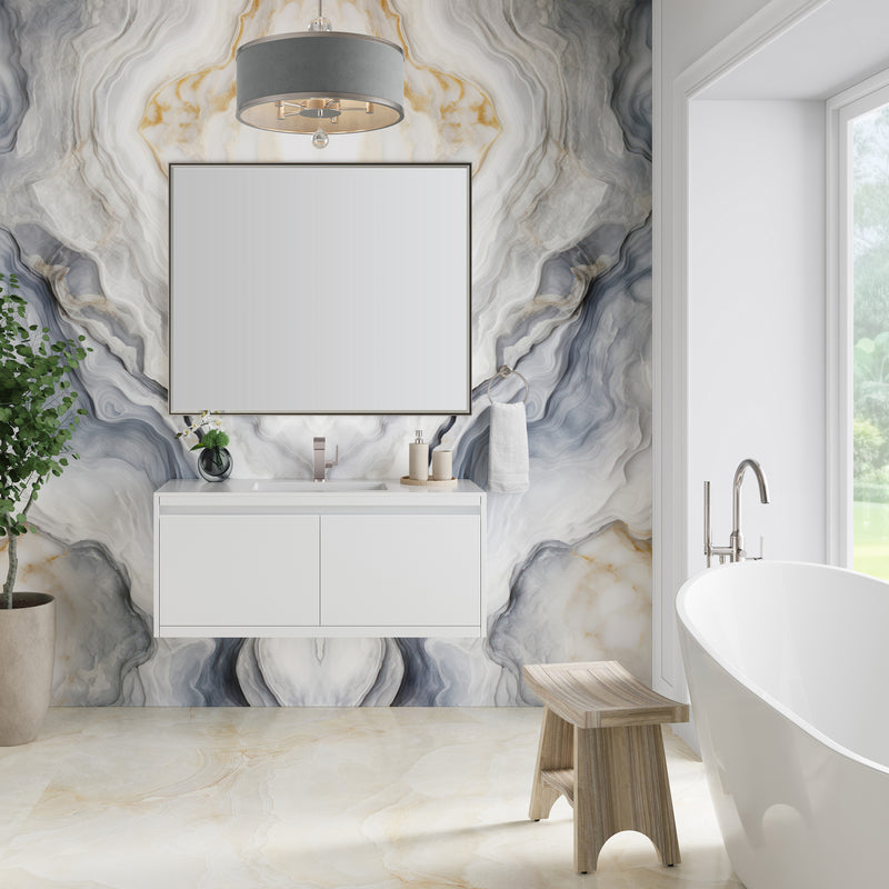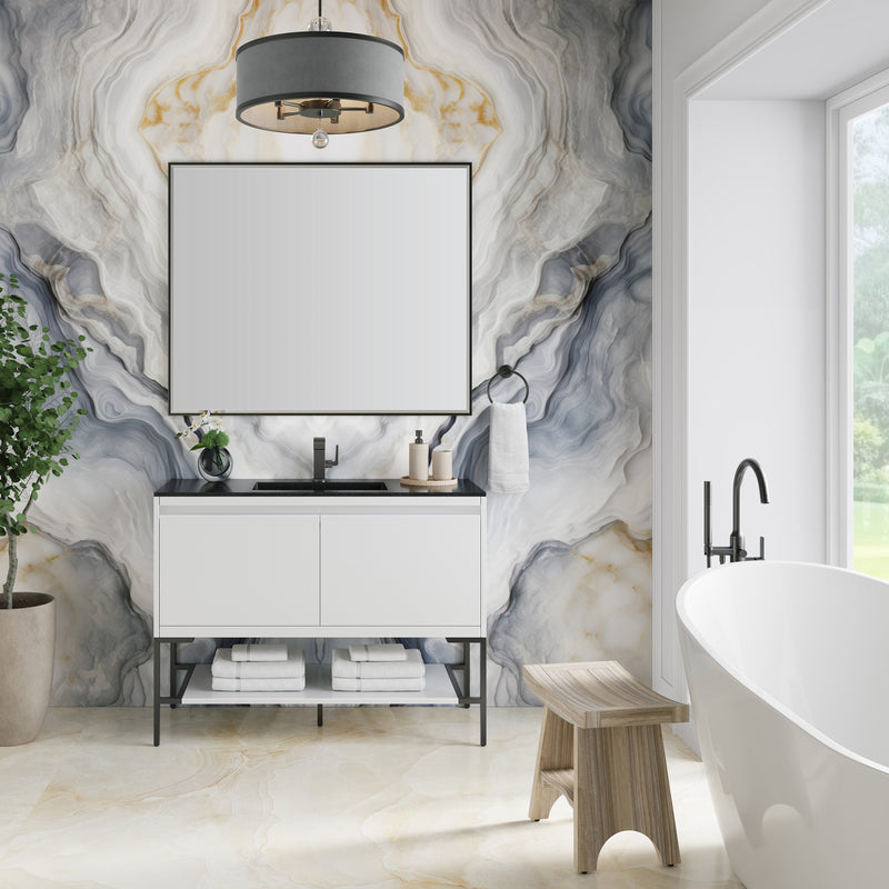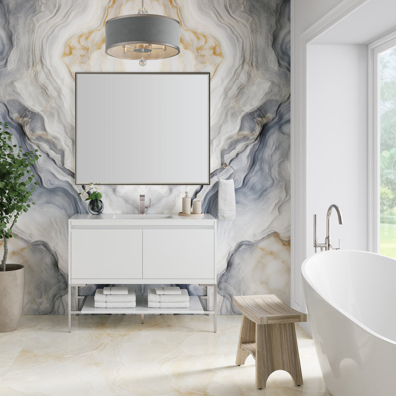 - 47.3" Mantova Single Bathroom Vanity: The largest Mantova bathroom vanity, this piece is an ideal choice for larger half-bathrooms or small-to-mid-sized, full bathrooms. At 47.3”, this single-sink unit best showcases the concealed drawers and sleek geometric silhouette that makes this collection unique. Plenty of storage space is available within the four interior drawers, lower, open shelf, and removable drawer organizer.
