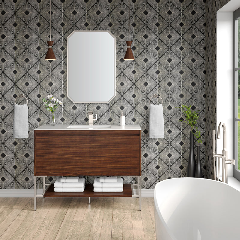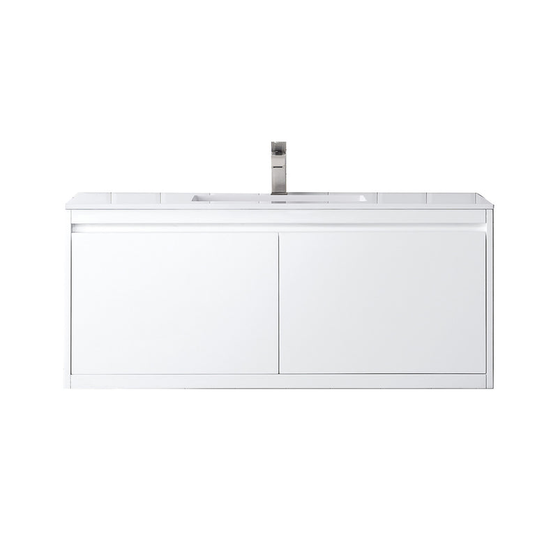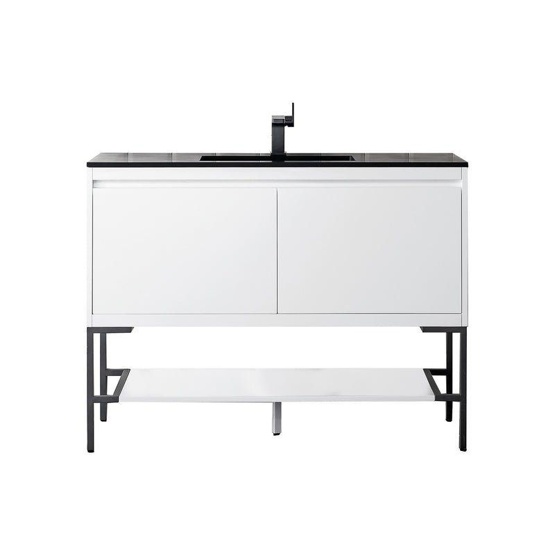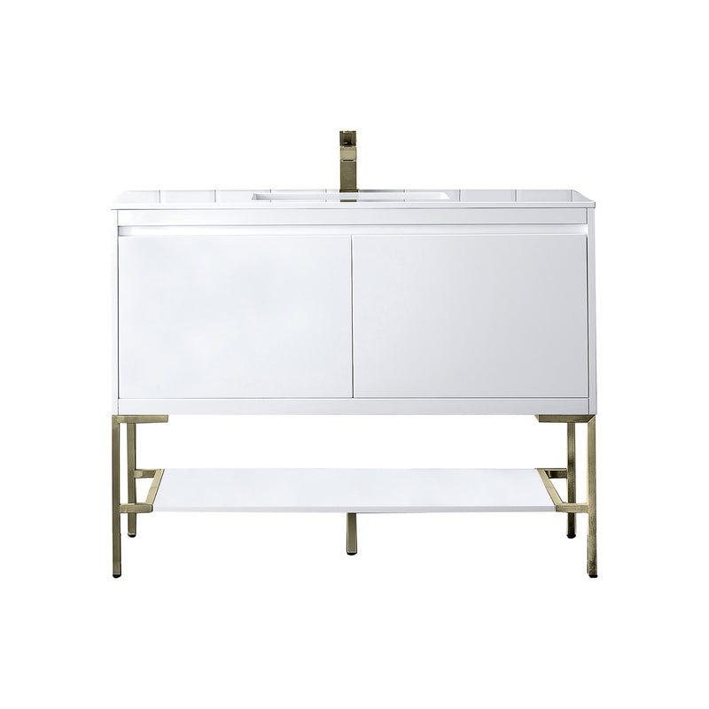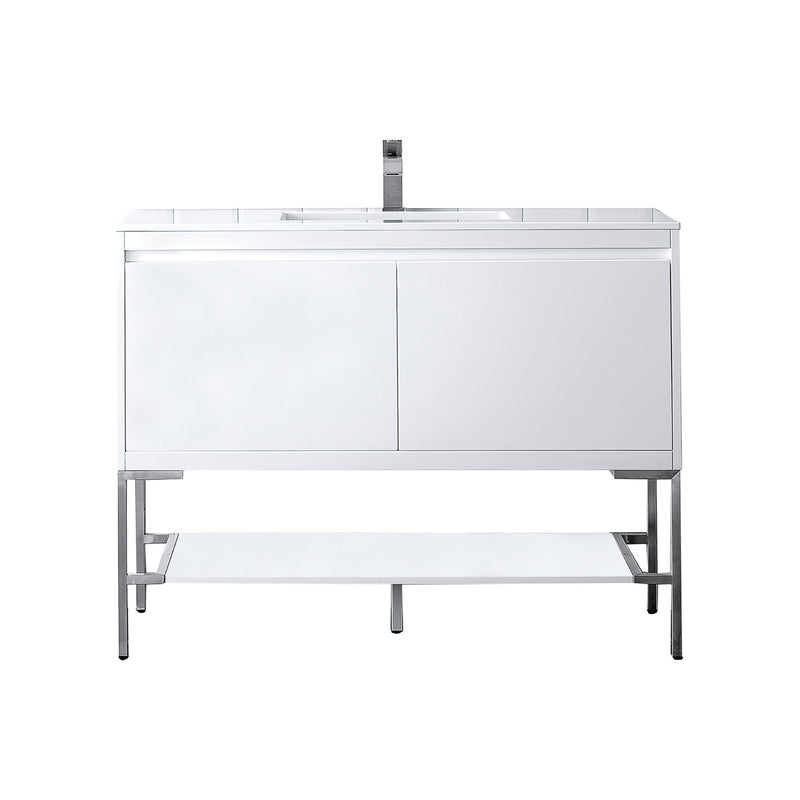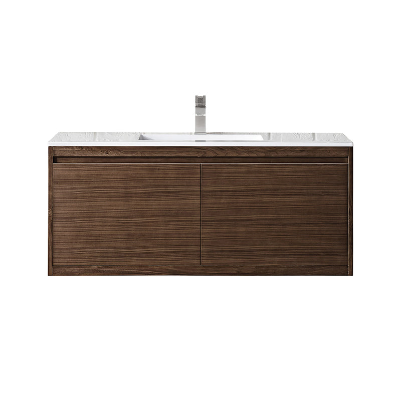 - 47.3" Mantova Single Bathroom Vanity: The largest Mantova bathroom vanity, this piece is an ideal choice for larger half-bathrooms or small-to-mid-sized, full bathrooms. At 47.3”, this single-sink unit best showcases the concealed drawers and sleek geometric silhouette that makes this collection unique. Plenty of storage space is available within the four interior drawers, lower, open shelf, and removable drawer organizer.