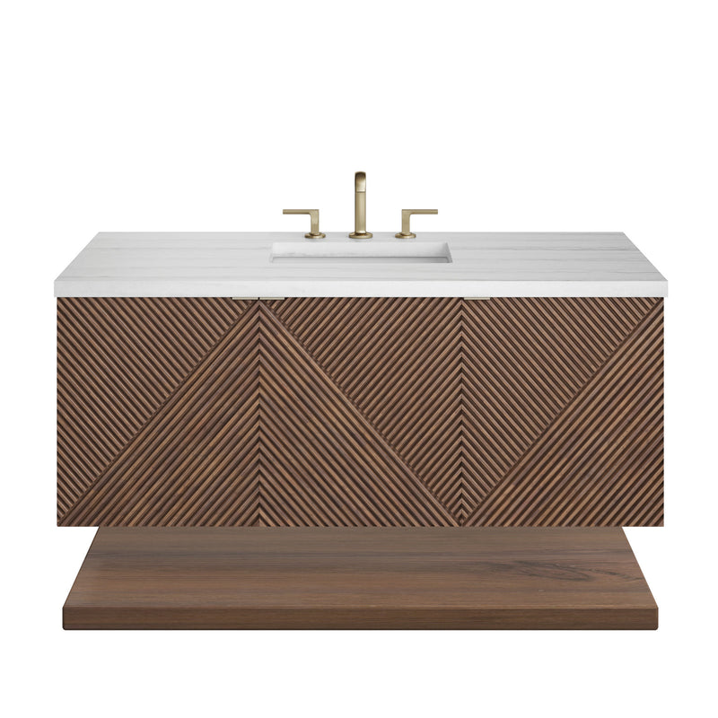 Striking wood details and a coordinating floating bottom shelf create a spa-like touch of luxury.