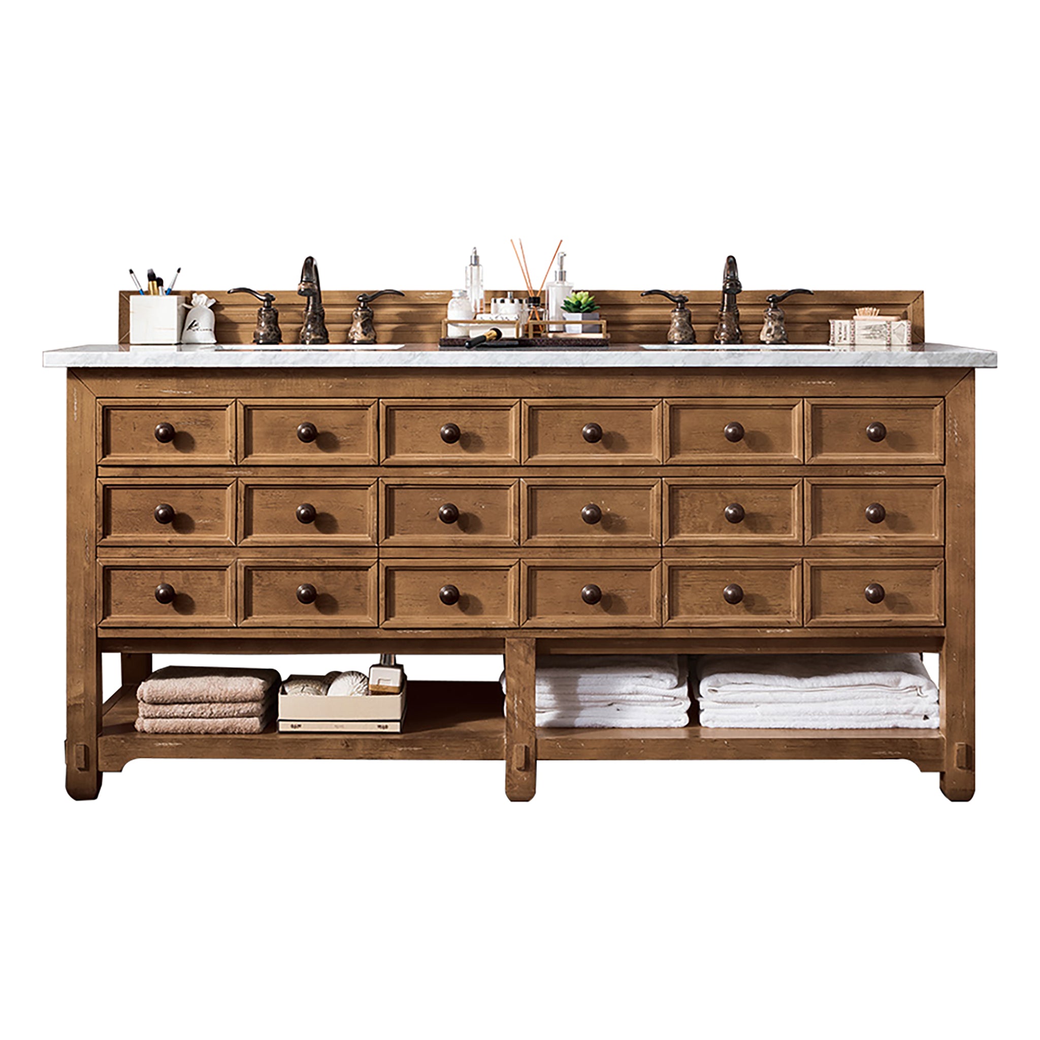 The Apothecary-inspired Malibu collection blends a variety of design aesthetics together, making it a perfect choice for Farmhouse, Rustic, Boho and Coastal interior stylings. Finished in Honey Alder and unique hand-distressing, the Malibu includes a decorative wooden backsplash and Rustic Iron drawer knobs. With drawers to conceal your bathroom necessities and an open console shelf to display towels and linens, the Malibu collection has been a fan favorite for years. This vanity comes with our Eternal Jasmine Pearl Quartz, predrilled for an 8" widespread faucet and two sinks.