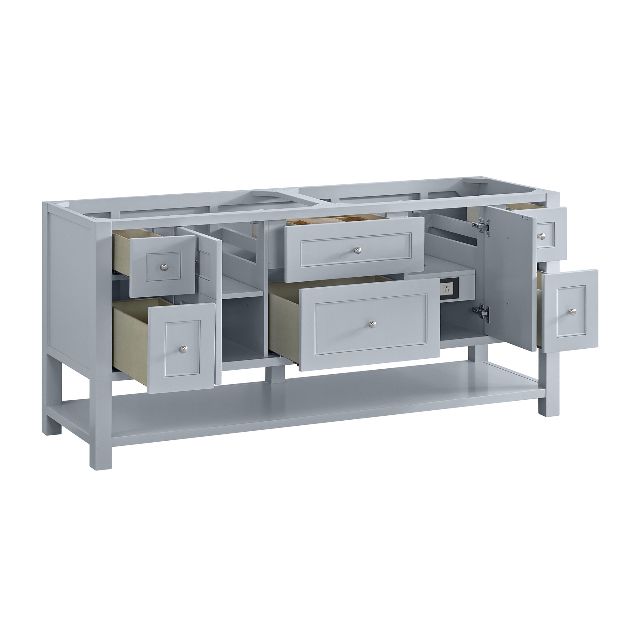 The Breckenridge 72" Double Vanity by James Martin Vanities is a fresh take on traditional Mission furniture that easily transitions to Modern Farmhouse style with an air of understated sophistication. Satin Nickel knobs complement the Serenity Blue finish, while the neatly inset door and drawer fronts lend a fresh appeal to this clean-lined classic. Two single-door cabinets open to reveal interior shelves equipped with a convenient built-in USB/120V power outlet. This console-style vanity also features six full-extension drawers and an open lower shelf for additional storage. A beautiful Victorian Silver Silestone® top with undermount sinks completes the look.