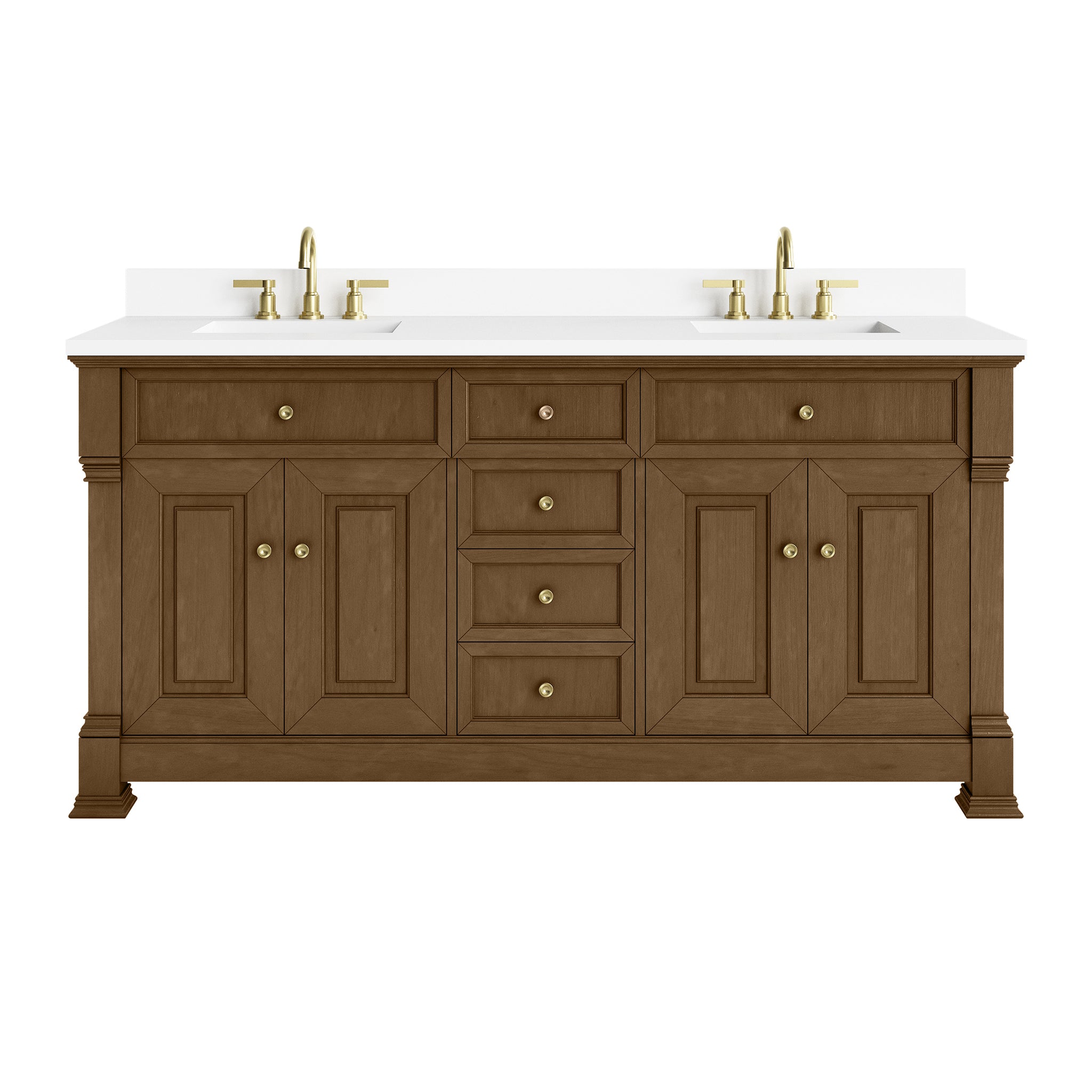 The Brookfield 72" Double Vanity in Honey Oak by James Martin Vanities offers a blend of traditional elegance and contemporary sophistication. The raised panel picture frame doors and detailed corner molding reflect timeless craftsmanship, while the warm Honey Oak finish and Champagne Brass hardware lend a fresh, modern appeal. This beautifully crafted vanity features two double-door cabinets that open to interior shelves, along with four standard drawers for ample storage. The warm wood tones highlight the natural Oak wood grains, lending sophistication and charm to your space. The addition of a White Zeus top and backsplash with white porcelain undermount sinks completes the look.