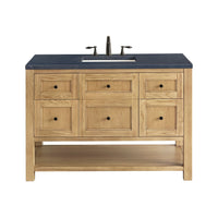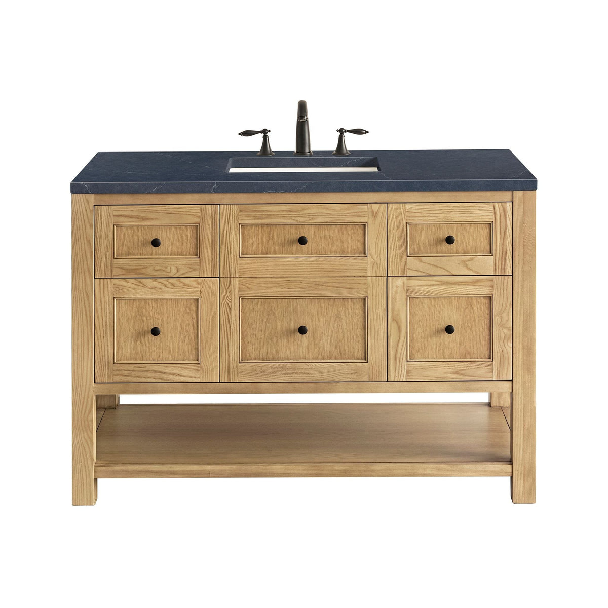 The White Oak cathedral grain veneers brings this modern classic vanity to life. The 48" Breckenridge Vanity in Light Natural Oak with Matte Black mushroom-style knobs is Modern Farmhouse at its best.. This vanity's clean, symmetrical façade features a center door that opens to a convenient dual-power USB outlet. Four drawers and a removable Bamboo drawer organizer tray provide additional organization. The lower, integrated shelf offers extra storage for towels and decor.
