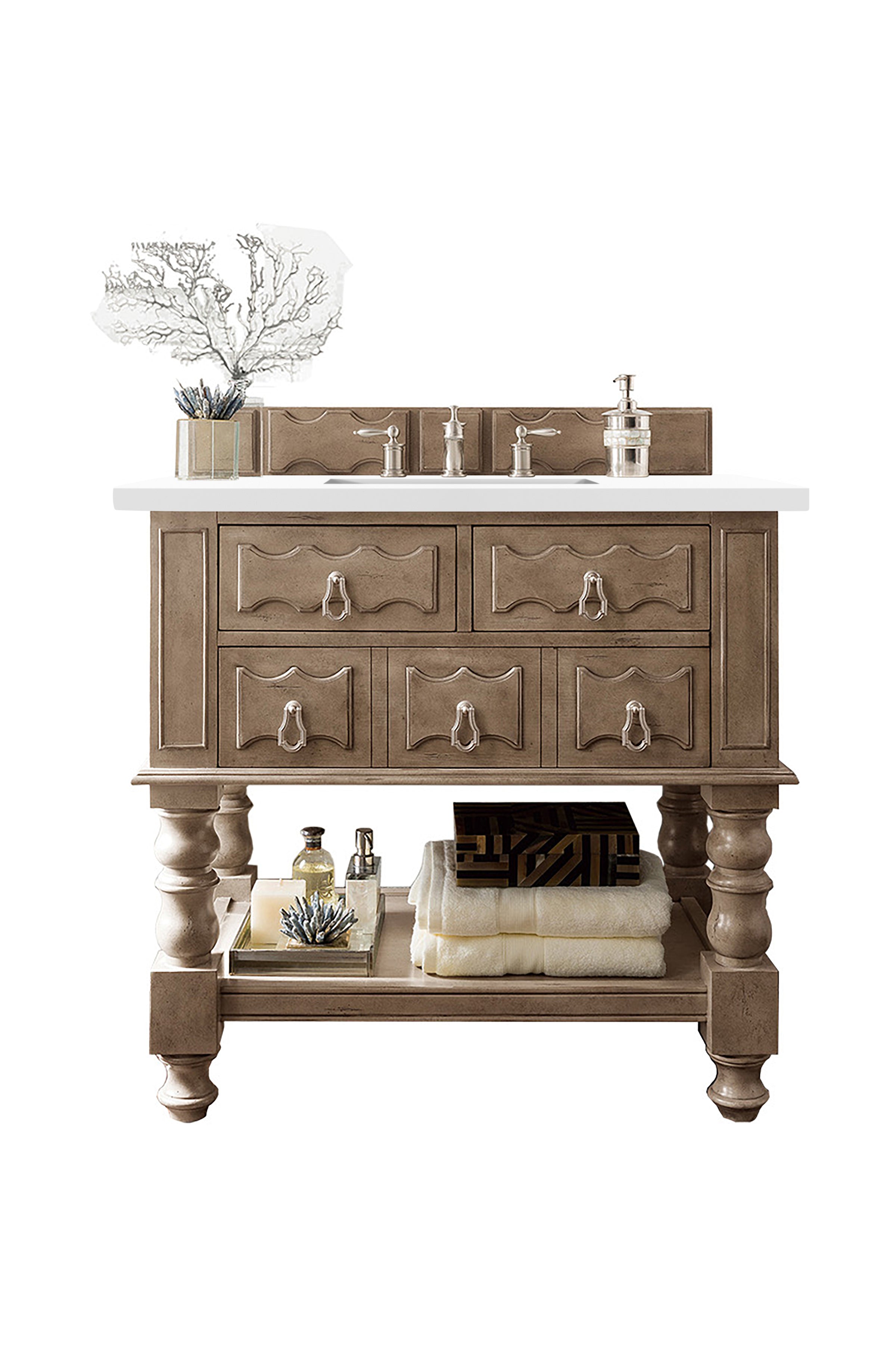The Castilian 36" Empire Gray Single Vanity Cabinet by James Martin Vanities features hand-carved raised bun feet and raised panel drawer fronts. This piece includes two hide-away tip-out top drawers as well as one U-Shaped bottom drawer, offering maximum storage space around the plumbing. Dark Antique Brass hardware and matching decorative wood backsplash are included. The look is completed with a 3 CM eased edge White Zeus Silestone Quartz top and one white ceramic rectangular sink.