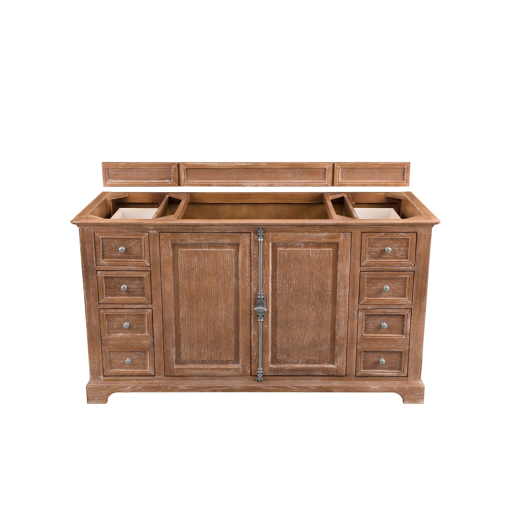 The Providence 60" Single Vanity in Driftwood by James Martin Vanities features a Plantation Style take that can take you anywhere. From the beach, to the cottage, to the cabin you will feel at home with this beautifully hand crafted piece of furniture as the focal point in your bathroom. Pewter finish Plantation Style door hardware and drawer pulls adorn two doors, with shelves for storage, and six drawers, with the bottom drawer on either side being double height for taller items. Matching decorative wood backsplash is included.