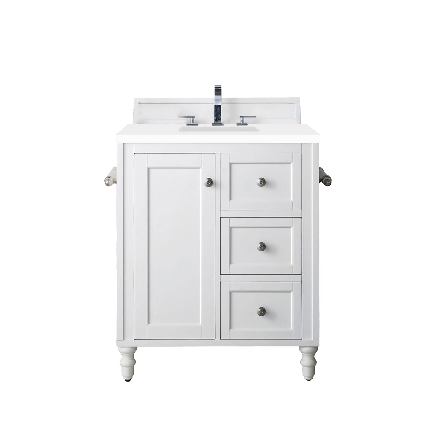 The Copper Cove Encore 30" Bright White Single Vanity by James Martin Vanities features optional towel bars, a bamboo drawer organizer, and interior shelf space. This cabinet also includes a decorative wood backsplash. The look is completed with a 3 CM eased edge White Zeus Silestone Quartz top with one white ceramic rectangular sink.