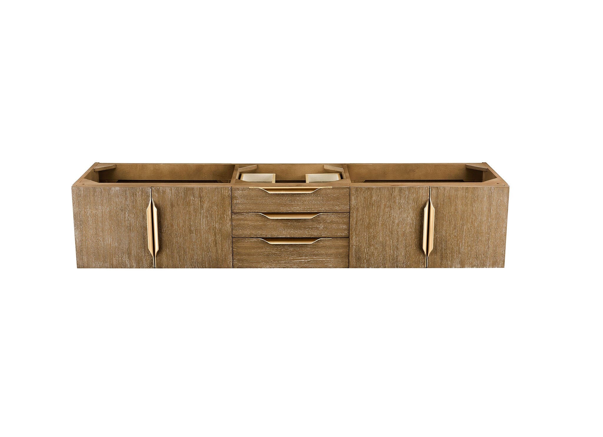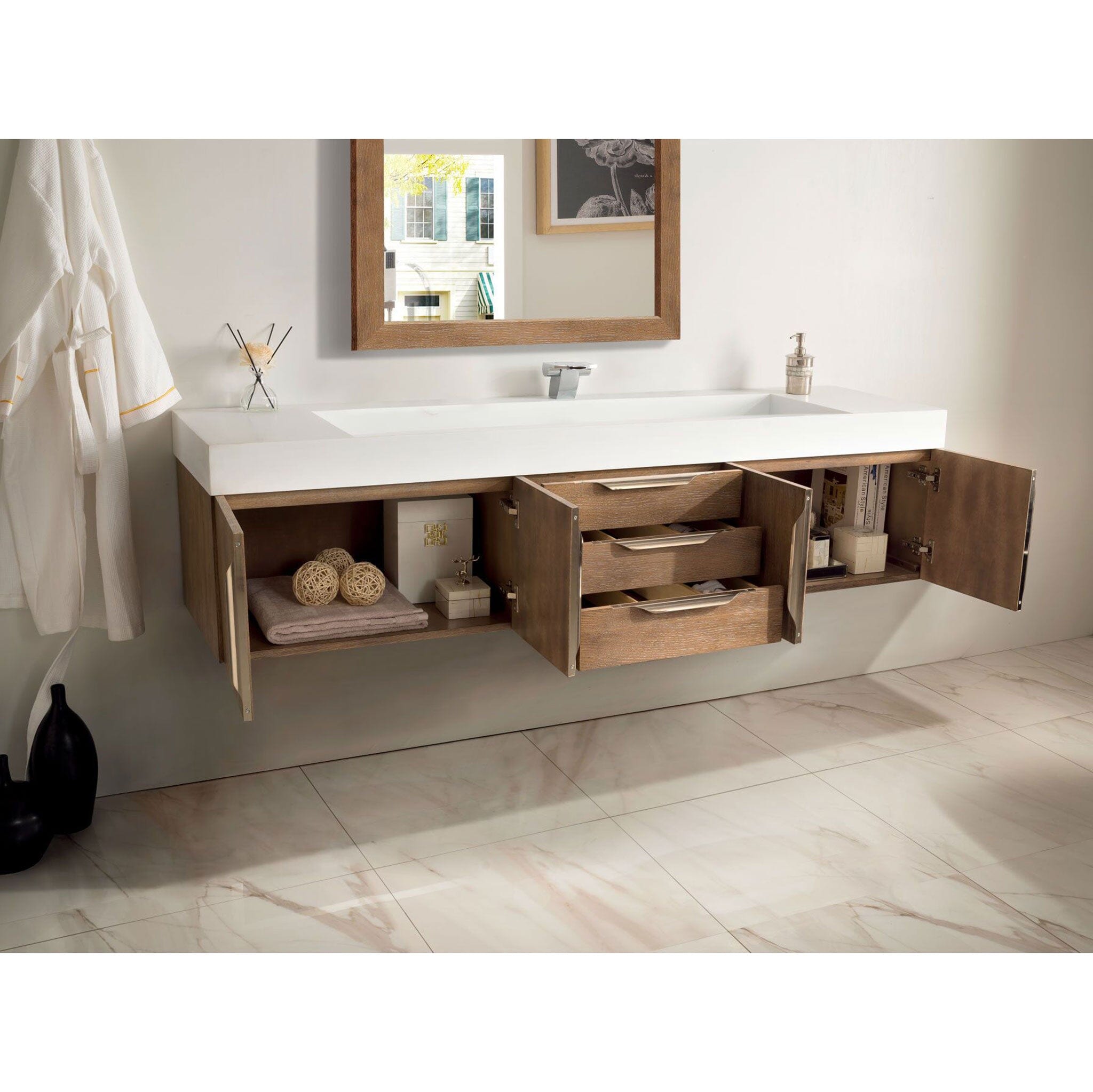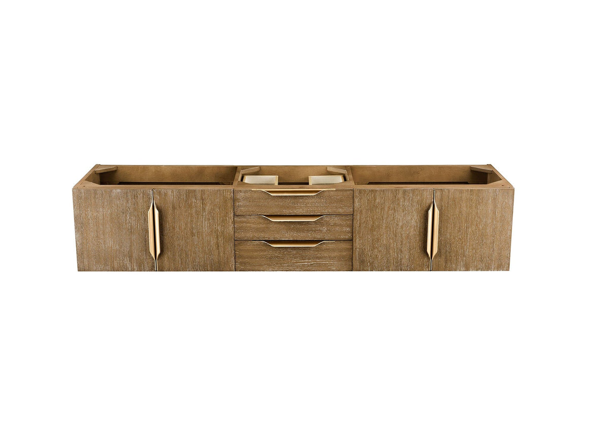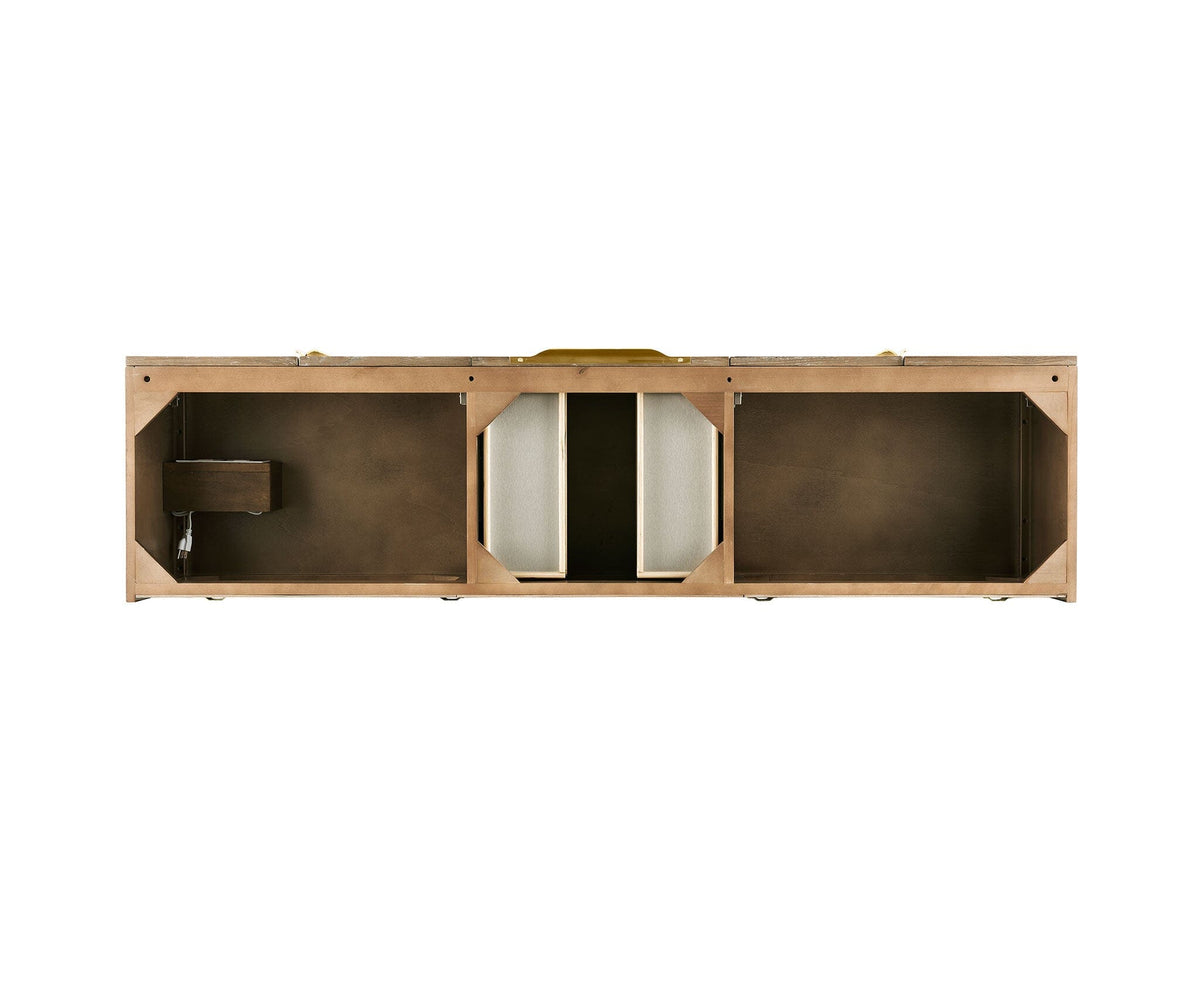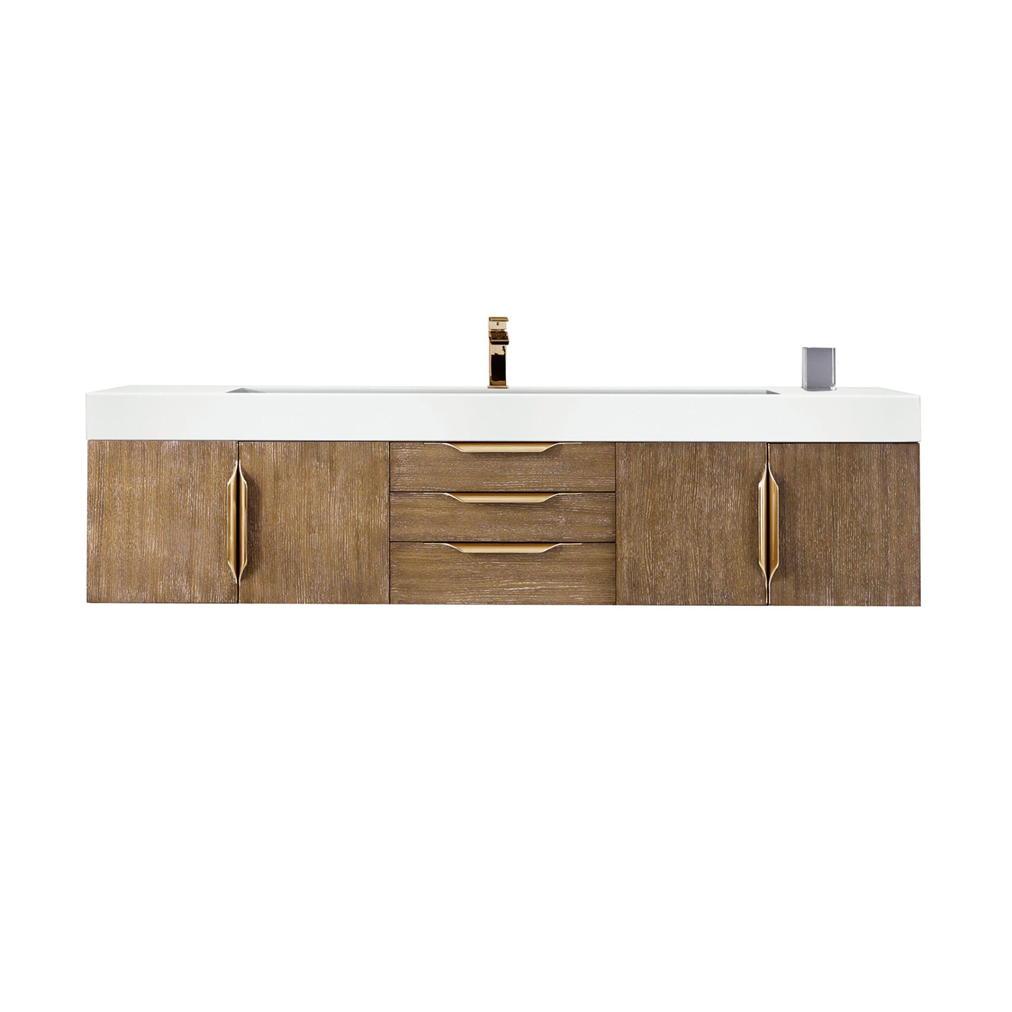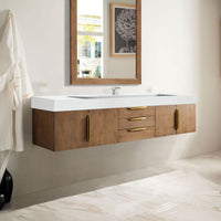 72" Columbia Floating Single Bathroom Vanity, Latte Oak w/ Radiant Gold and Glossy White Composite Stone Top