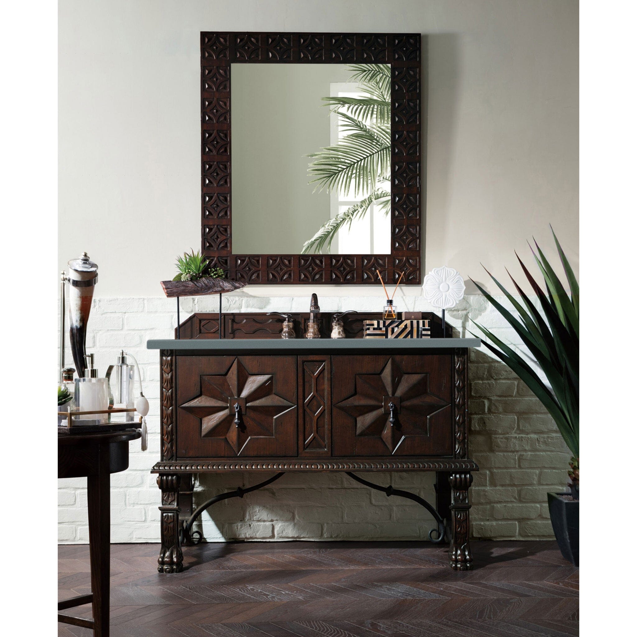 The Balmoral 48" Antique Walnut vanity by James Martin Vanities features hand-carved details, from the cabinet feet all the way through the doors. The beautiful decorative Iron scrollwork accents this piece which includes two doors with open storage space. Antique pewter finished door pulls complete the look. Each cabinet is configured to work with our variety of either 2cm, 3cm, or a 4 cm countertops. The matching decorative wood backsplash is included.