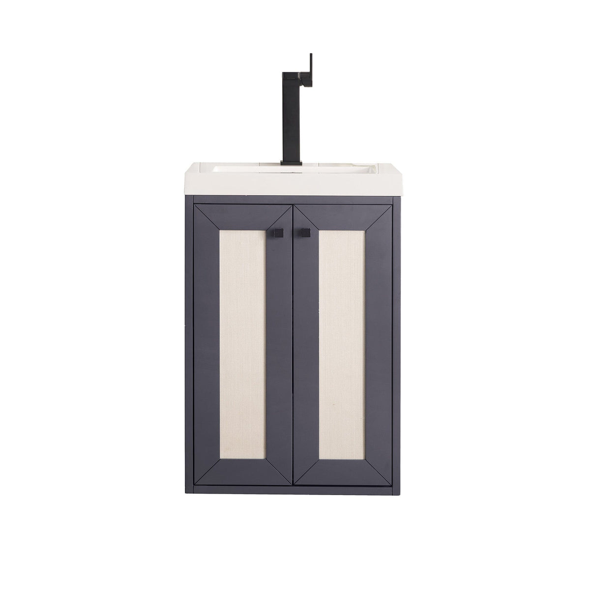 Space-saving, yet functional, this Chianti Vanity by James Martin Vanities compact design provides ample storage for any powder room or half bath. The simple silhouette gives you an almost minimalist look, but it can be paired with a variety of different decor. Featuring beautiful solid birch wood and engineered ash veneers construction this vanity has an elegant profile. This small space solution vanity can be purchase with either a sleek stainless-steel base or wall-mounted with just the cabinet and top for a more modern look. The doors of the vanity reverse from either a single-color panel or a fabric panel which will give you two additional display options, this truly a vanity that just keeps giving! The countertop is constructed of polyester solid surface with an integrated sink and is predrilled for your convenience. The brushed nickel hardware ties the piece together into an exquisite look.
