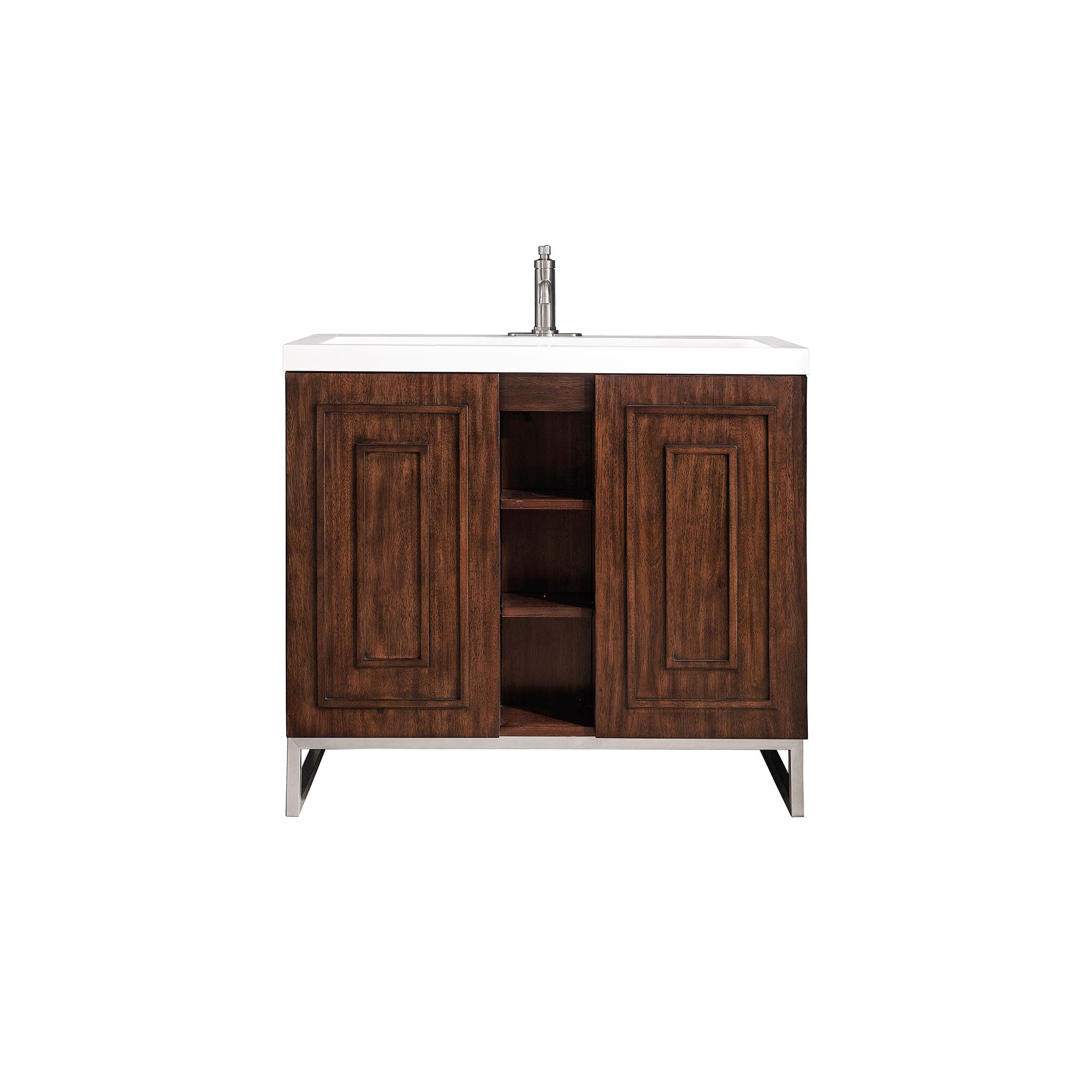 The Alicante collection by James Martin Vanities offers big style in a subtle design. Its sleek metal base and raised panel doors create the perfect modern bathroom vanity. Constructed from fine quality solid hardwoods and comes with our top-rated resin countertop making this piece the epitome of luxury bathroom furniture. Its timeless and versatile design is accentuated by its beautiful metal base and the vanity was built with external cubbies creating added storage for washroom essentials. This piece also gives you the option to float the look by removing the base. This vanity is sure to illuminate any bathroom with its opulent looks.