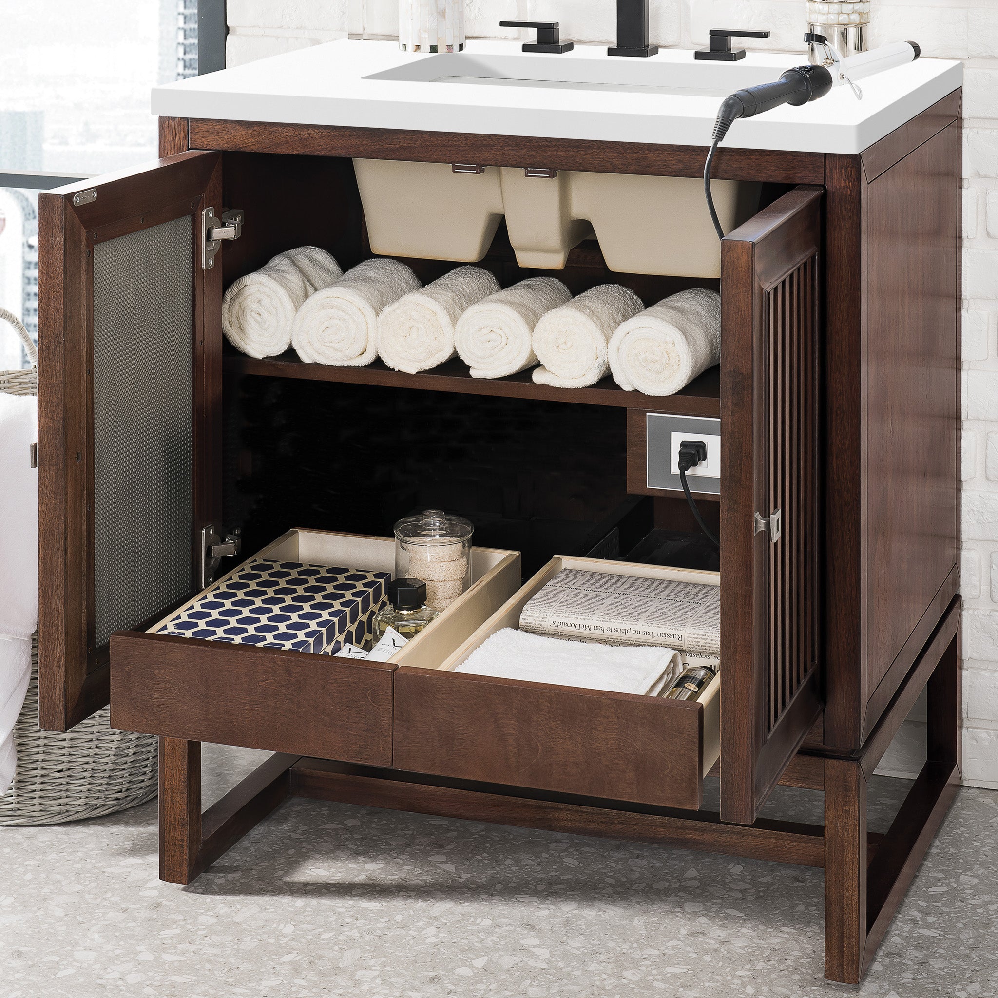 30" Athens Single Vanity Cabinet, Mid-Century Acacia w/ White Zeus Quartz Top