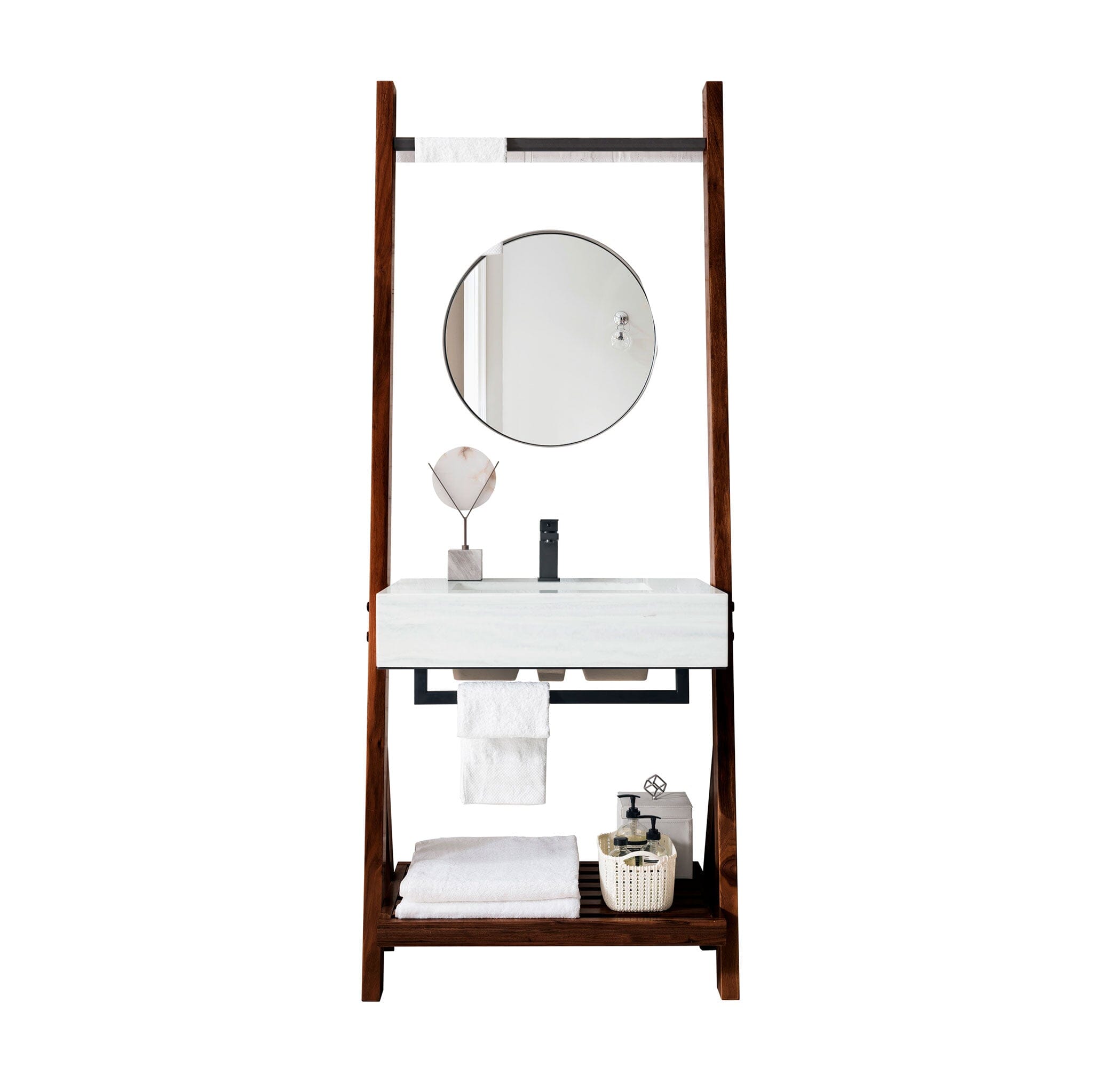 The Lakeside 30" Mid Century Walnut finish vanity is a unique, two-sided frame vanity. This vanity is constructed using birch solids and poplar veneers, with a stainless steel towel bar in a brushed nickel finish, as well as a solid wood slatted shelf for additional storage. The look of this vanity is completed with an arctic fall solid surface top with a wide apron, rectangular sink.