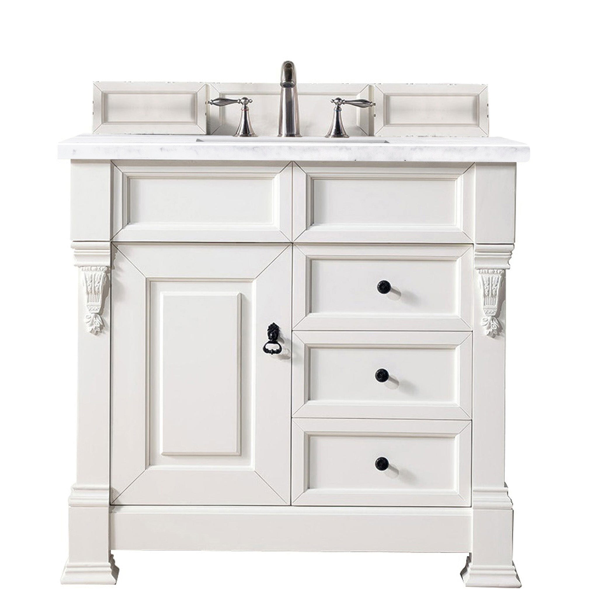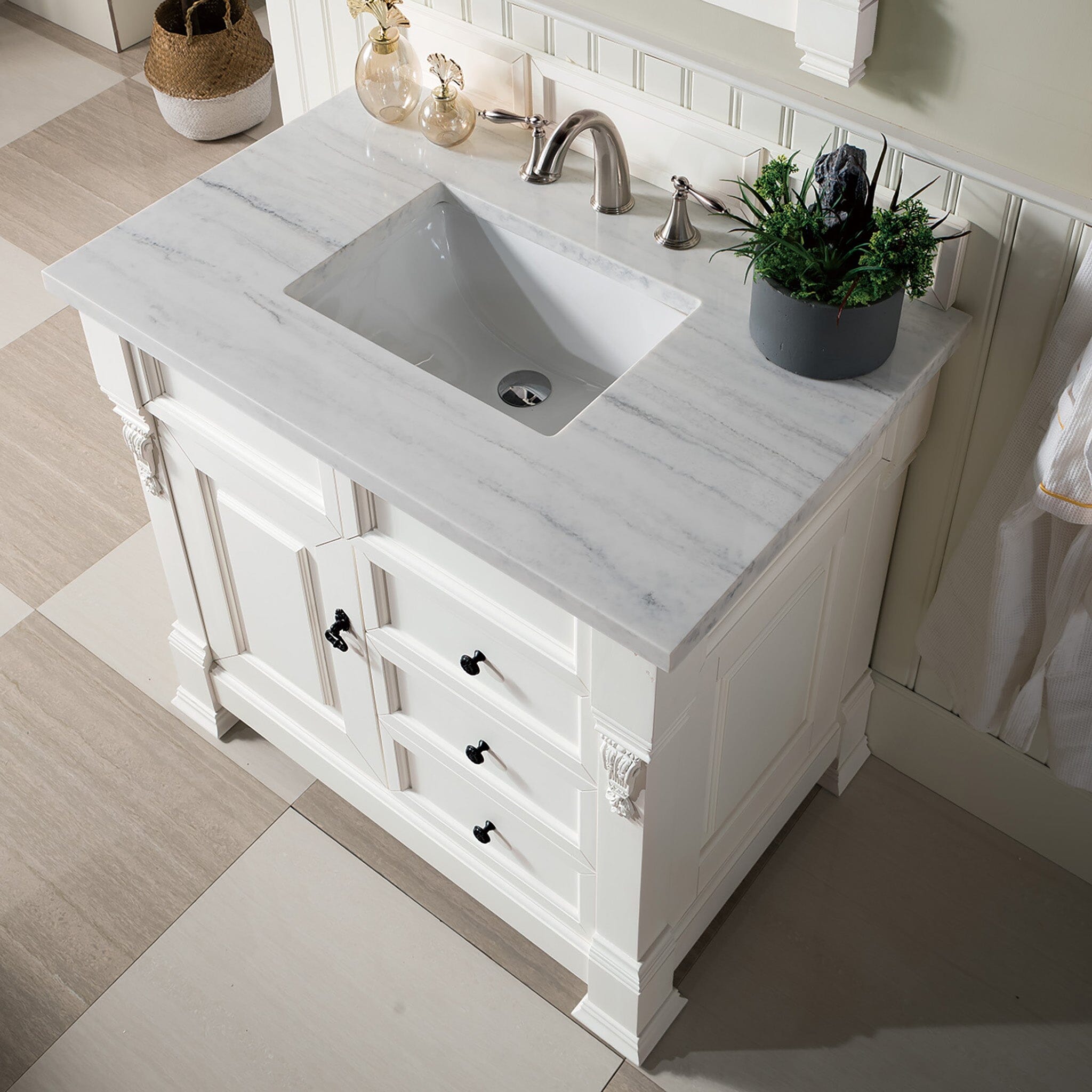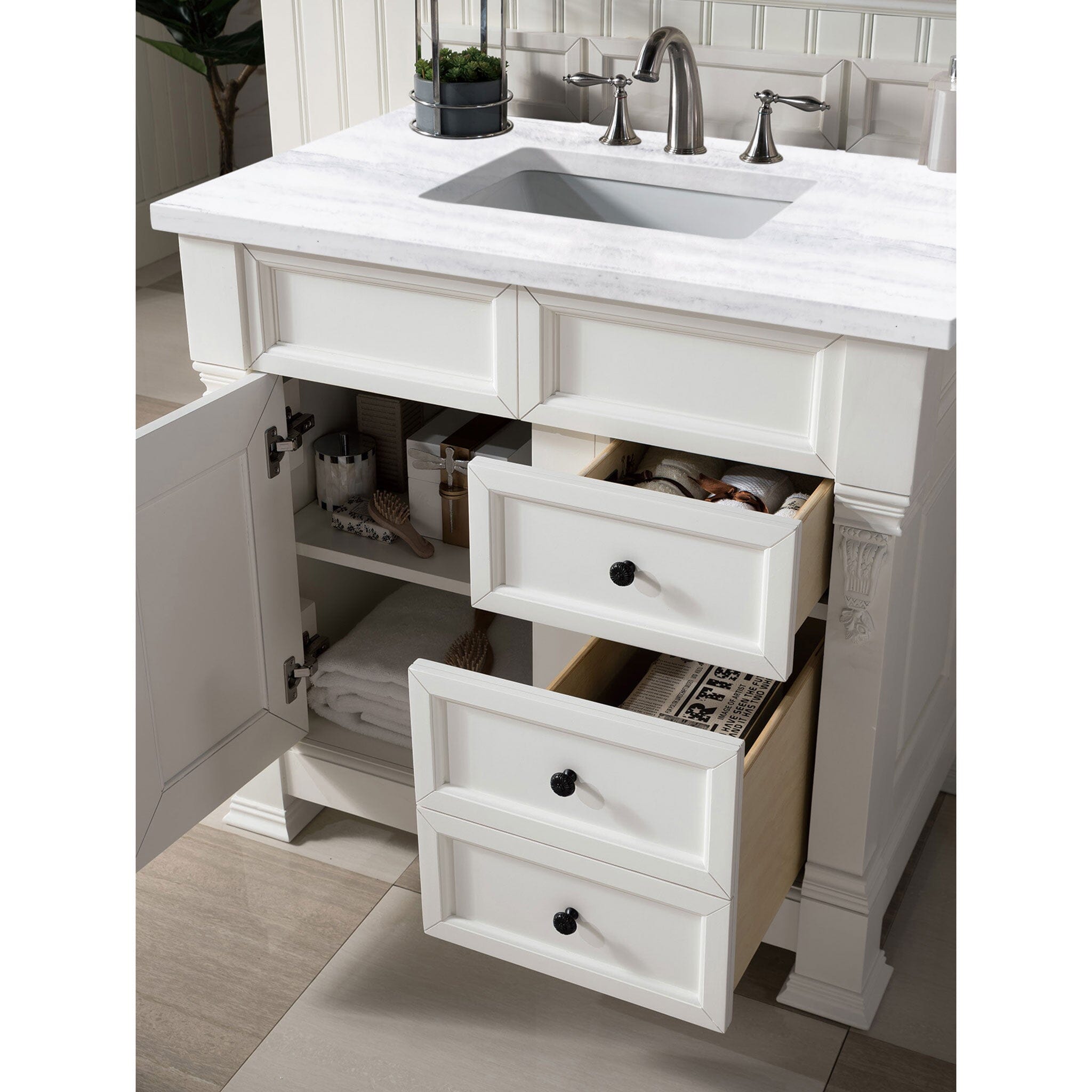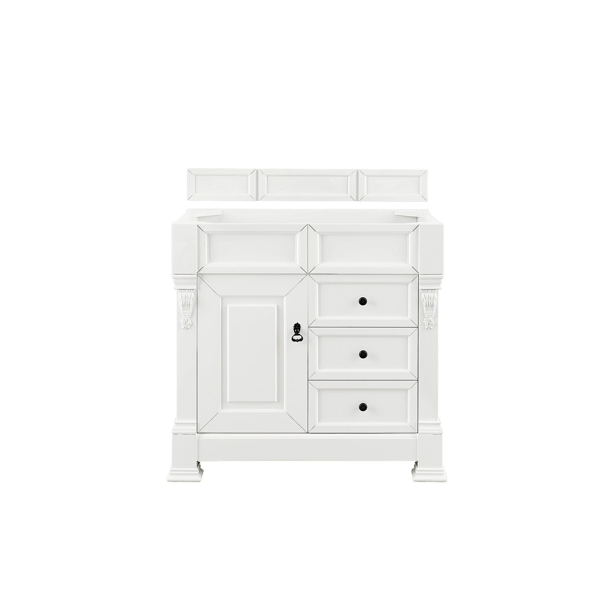 The Brookfield Collection by James Martin Vanities features hand carved accenting filigrees and raised panel doors. This collection is offered in a variety of finish colors. The look is completed with Antique Brass finish door and drawer pulls. A matching decorative wood backsplash is included with each cabinet.