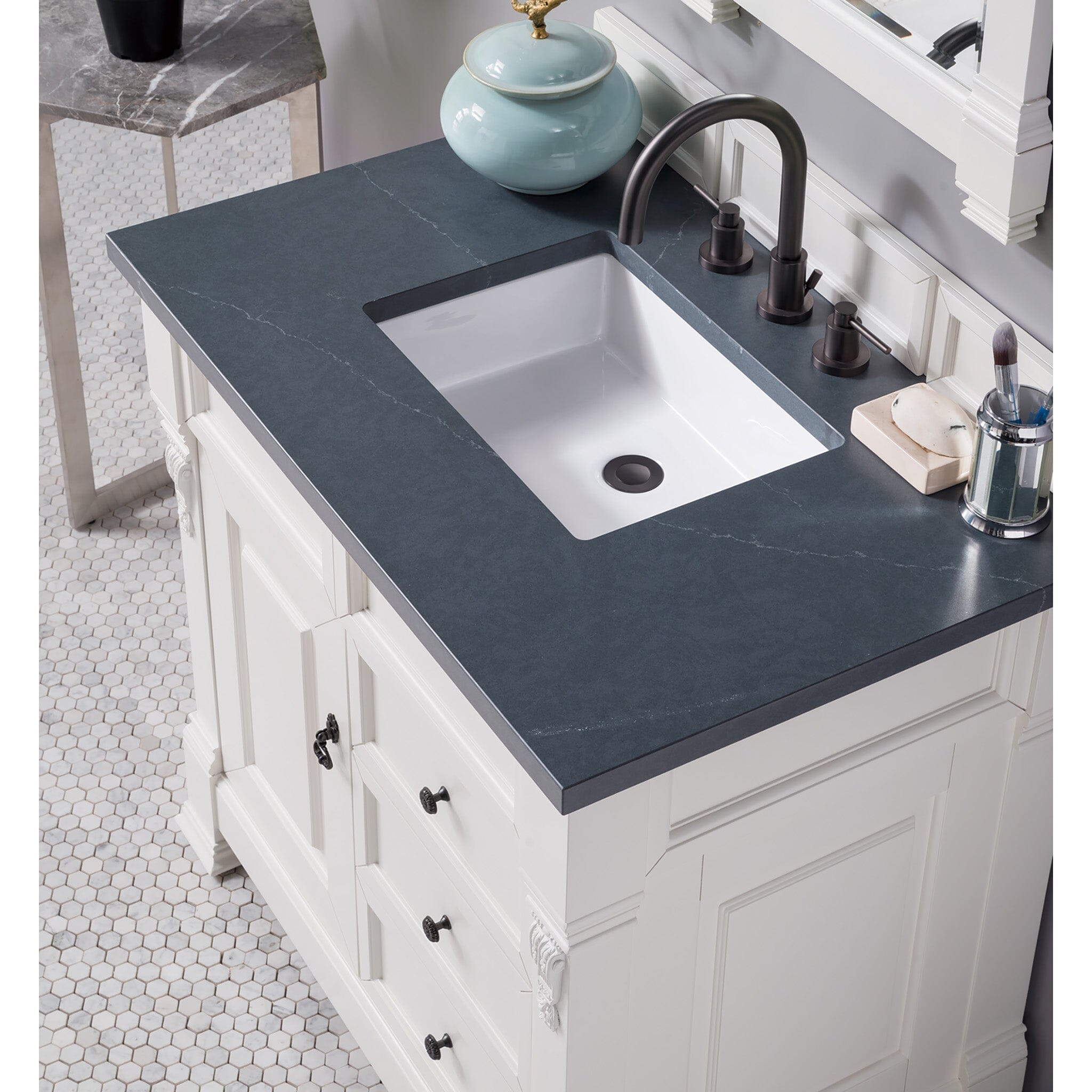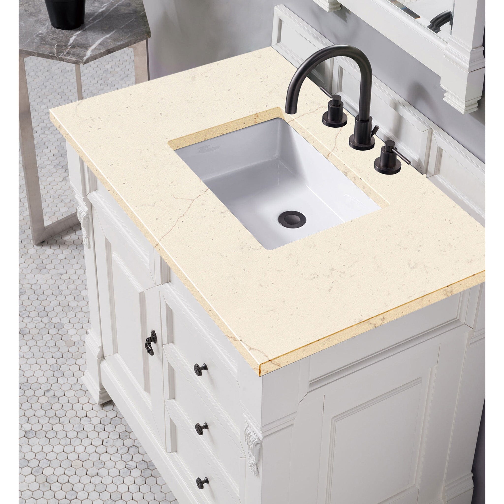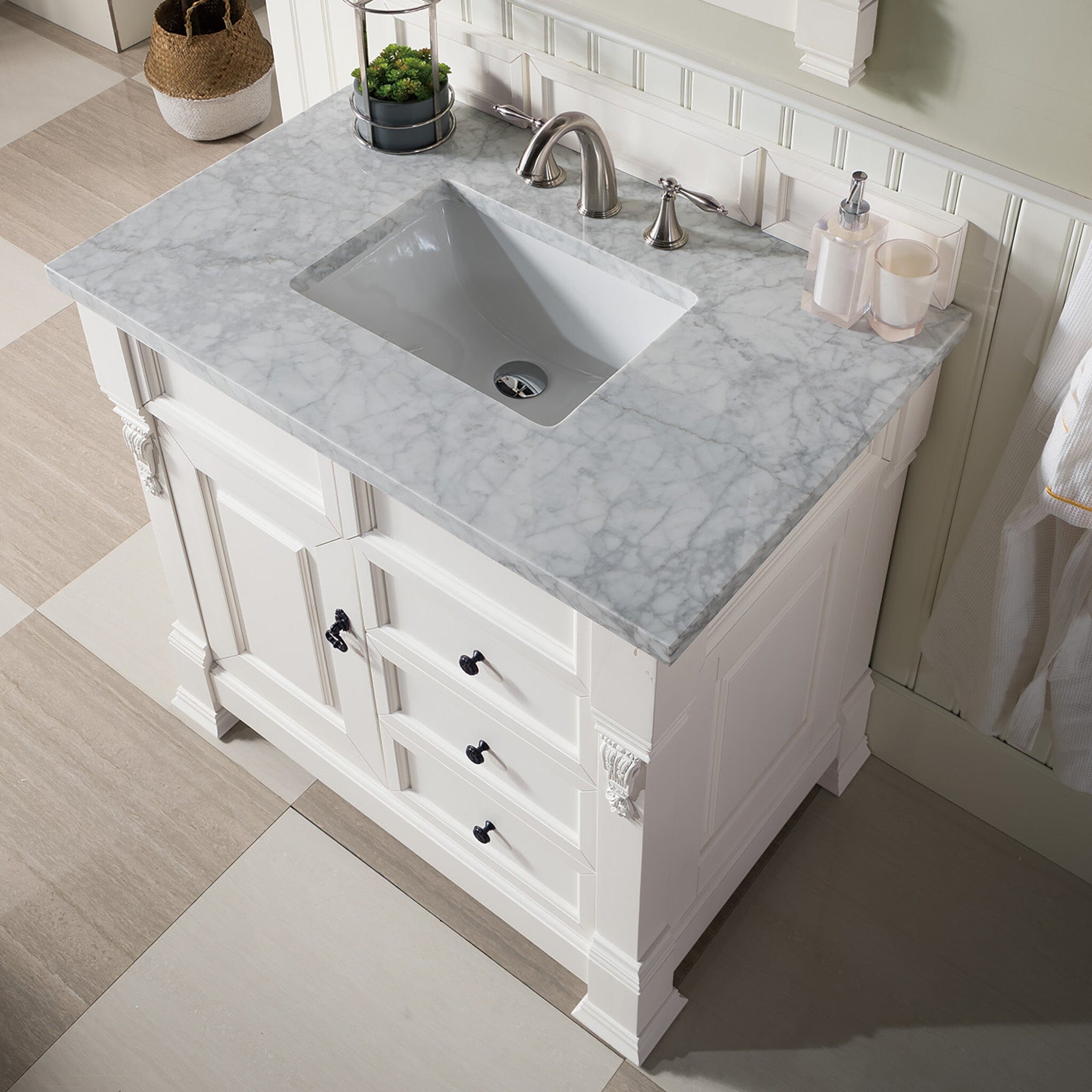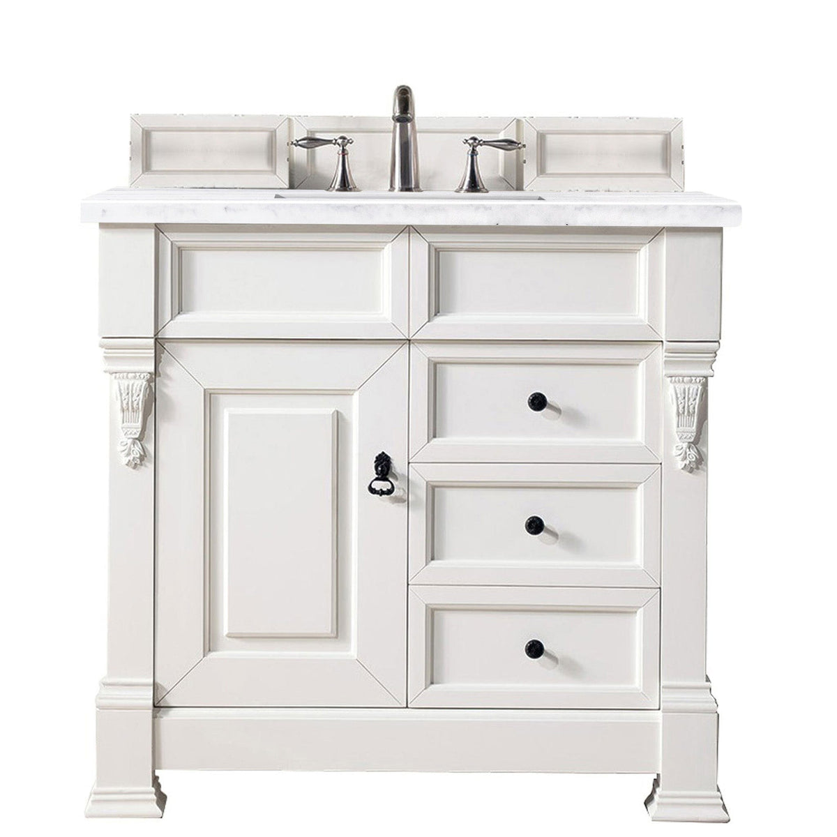 The Brookfield Collection by James Martin Vanities features hand carved accenting filigrees and raised panel doors. This collection is offered in a variety of finish colors. The look is completed with Antique Brass finish door and drawer pulls. A matching decorative wood backsplash is included with each cabinet.