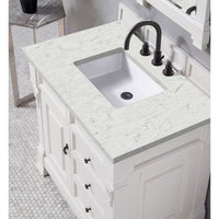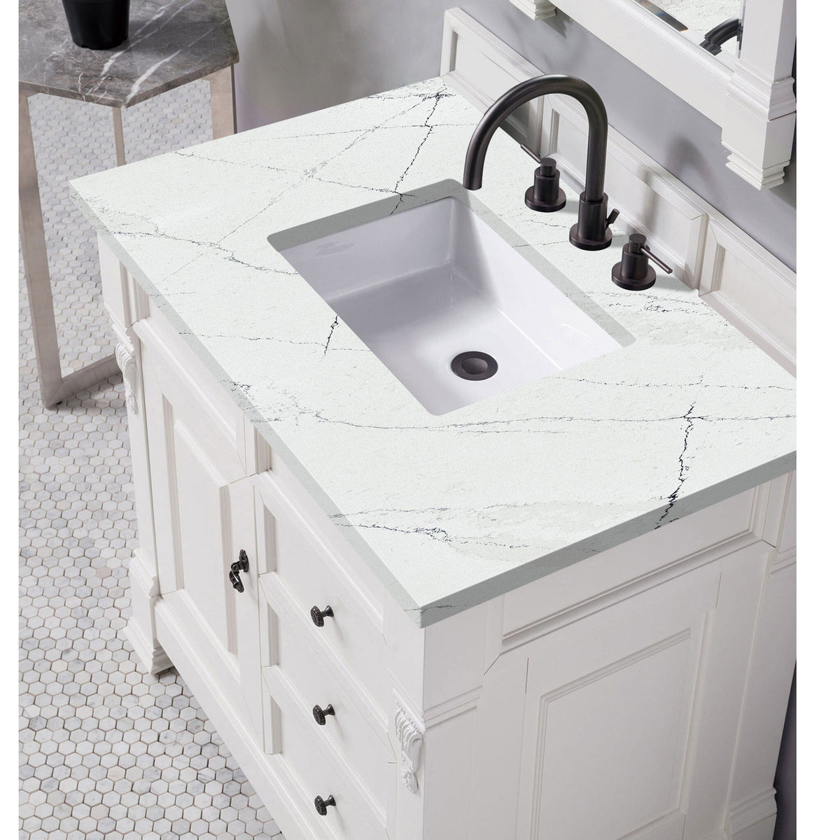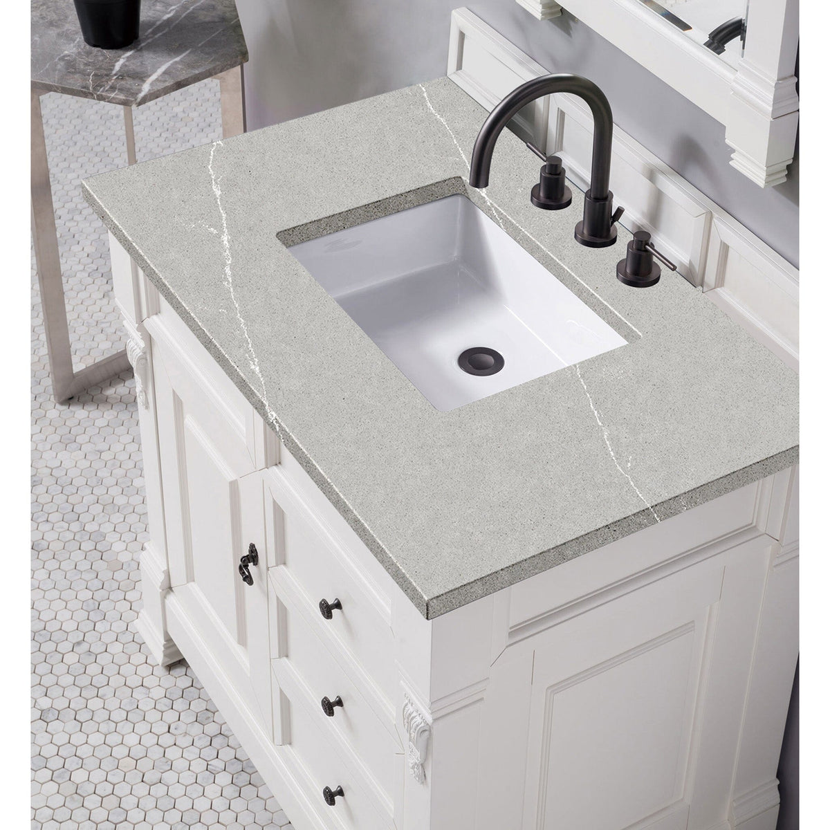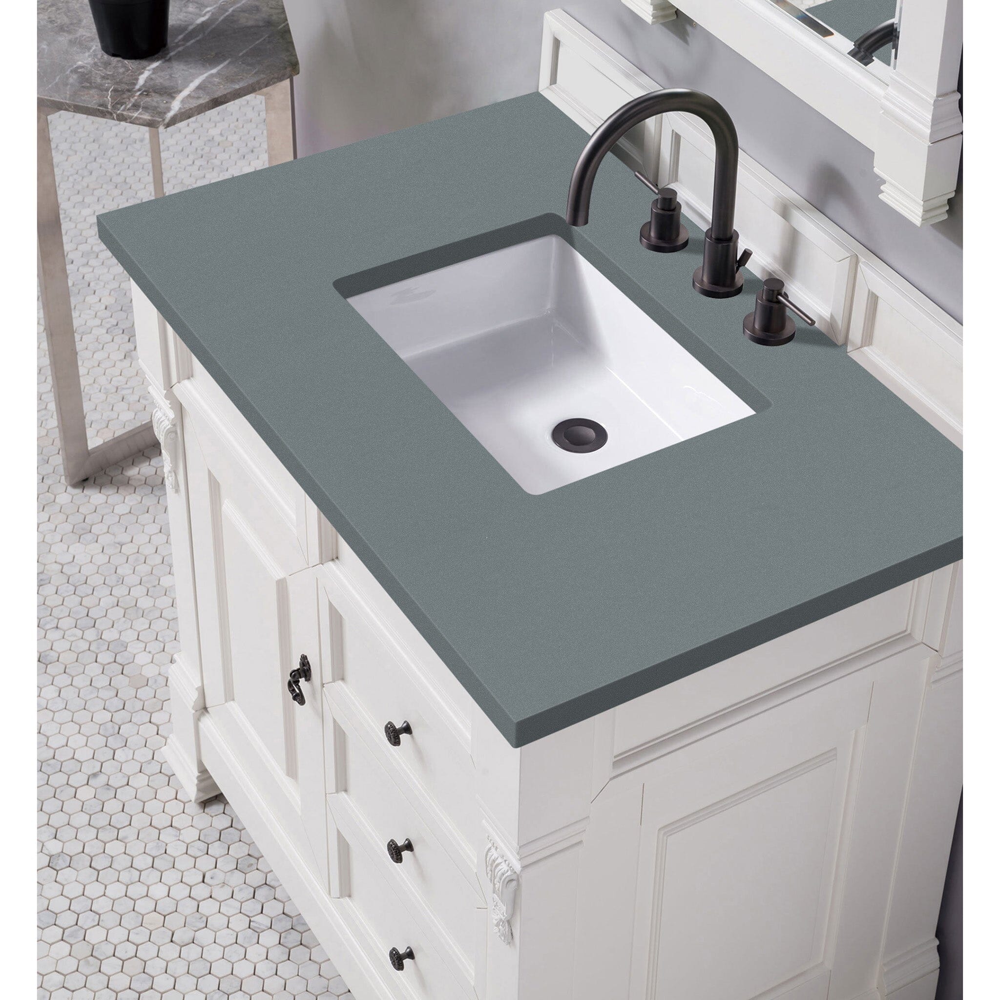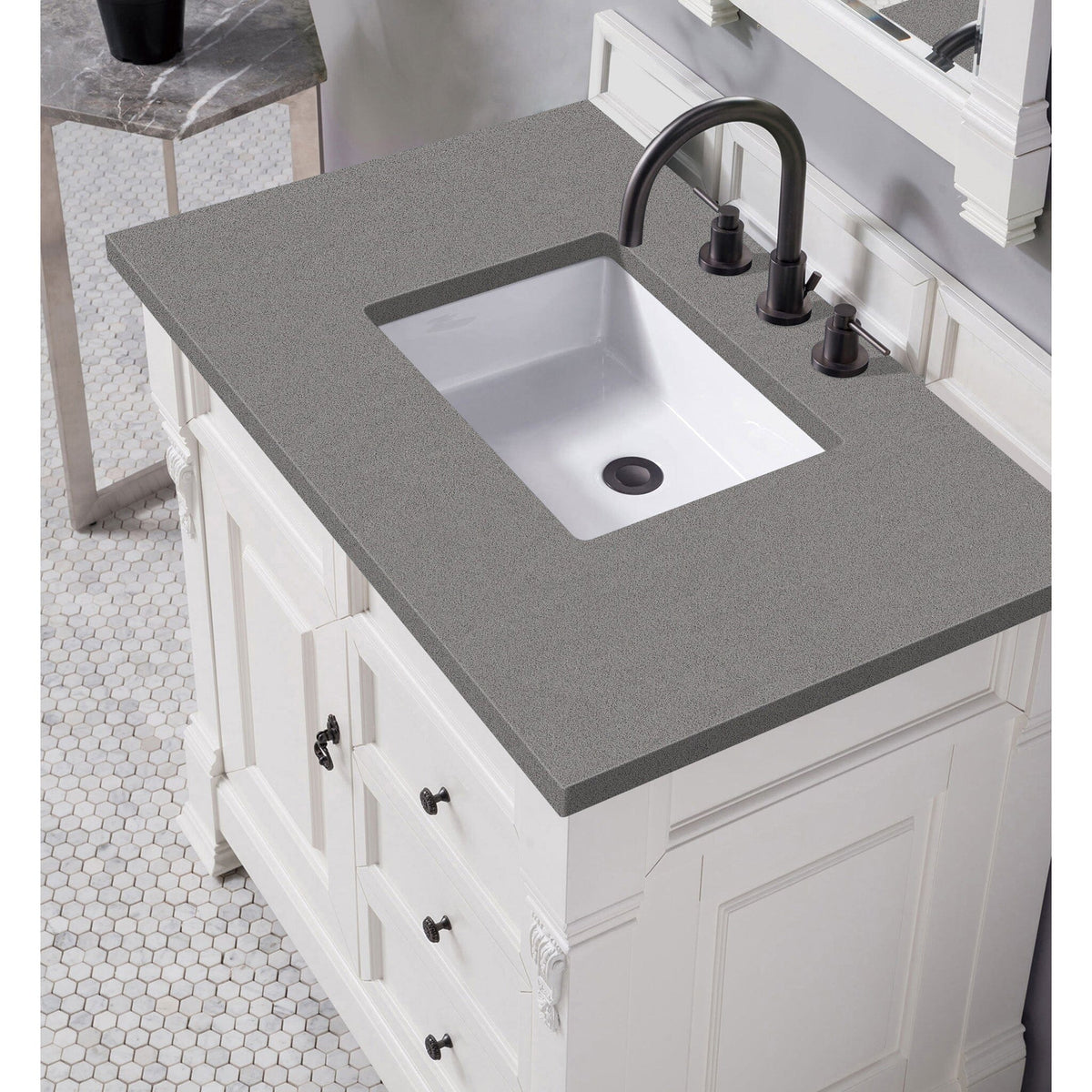 The Brookfield Collection by James Martin Vanities features hand carved accenting filigrees and raised panel doors. This collection is offered in a variety of finish colors. The look is completed with Antique Brass finish door and drawer pulls. A matching decorative wood backsplash is included with each cabinet.