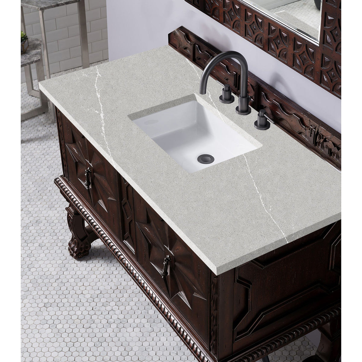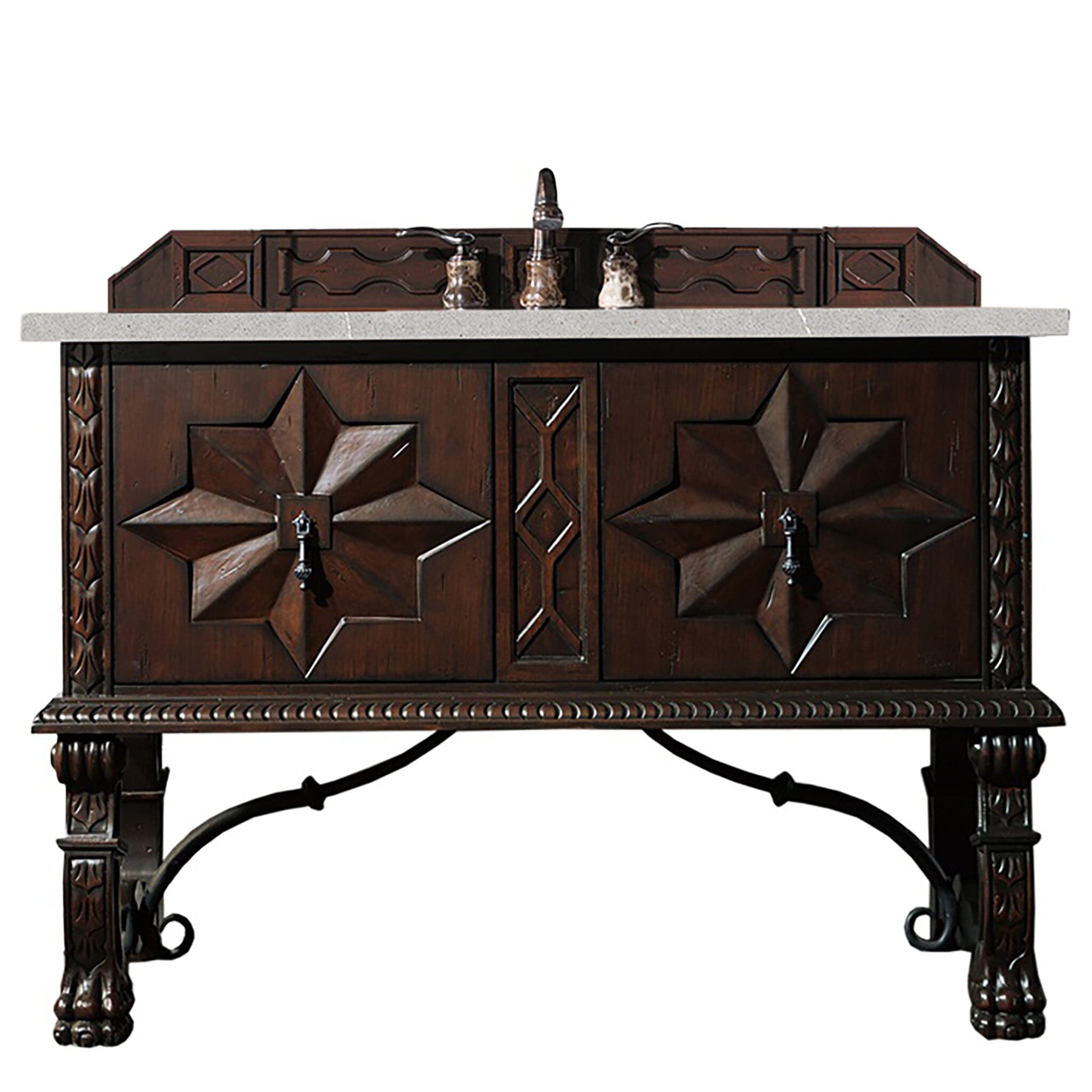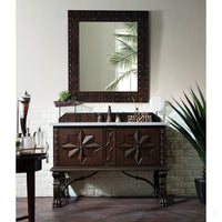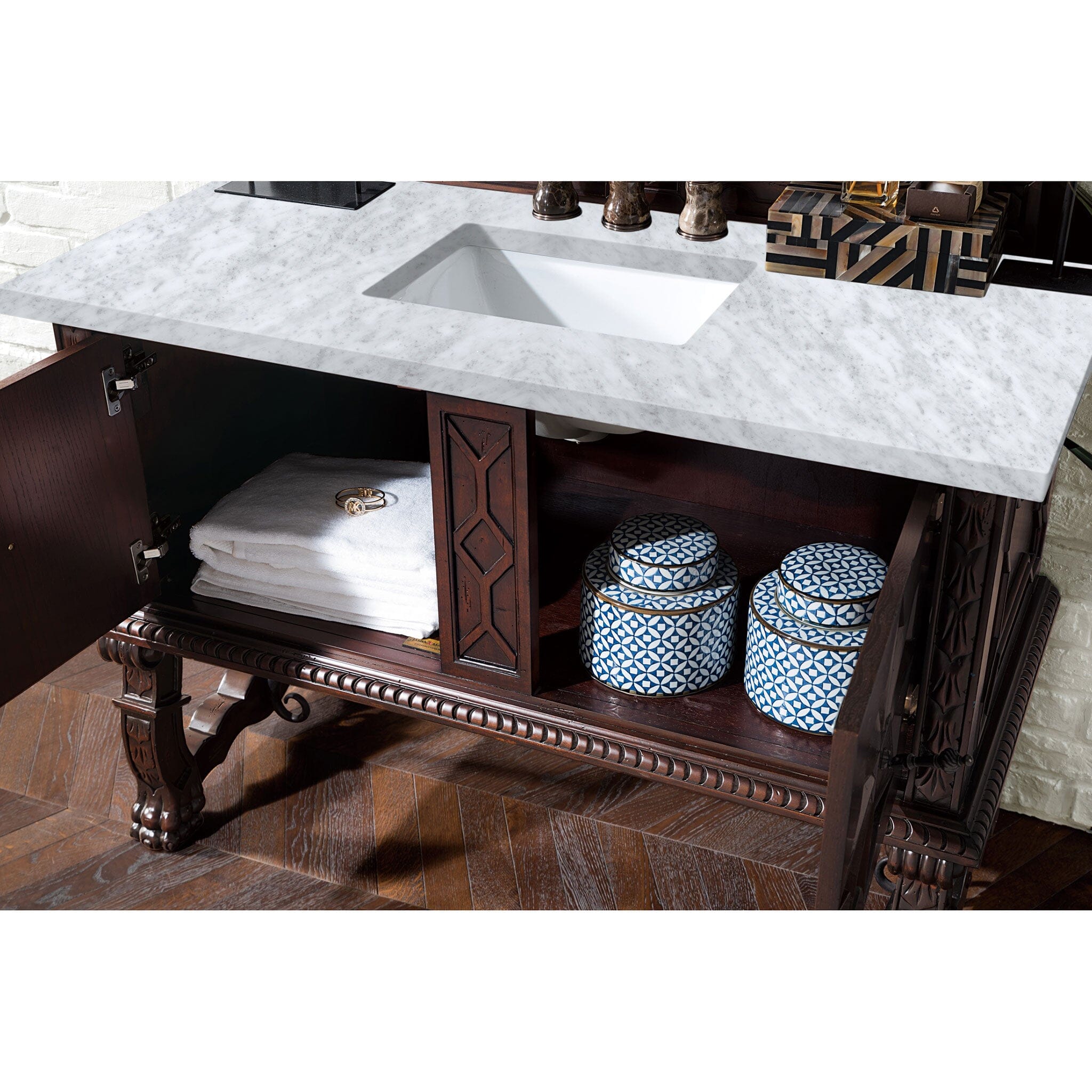 The Balmoral 48" Antique Walnut vanity by James Martin Vanities features hand-carved details, from the cabinet feet all the way through the doors. The beautiful decorative Iron scrollwork accents this piece which includes two doors with open storage space. Antique pewter finished door pulls complete the look. Each cabinet is configured to work with our variety of either 2cm, 3cm, or a 4 cm countertops. The matching decorative wood backsplash is included.