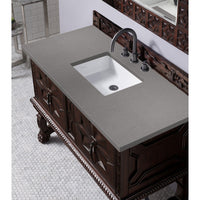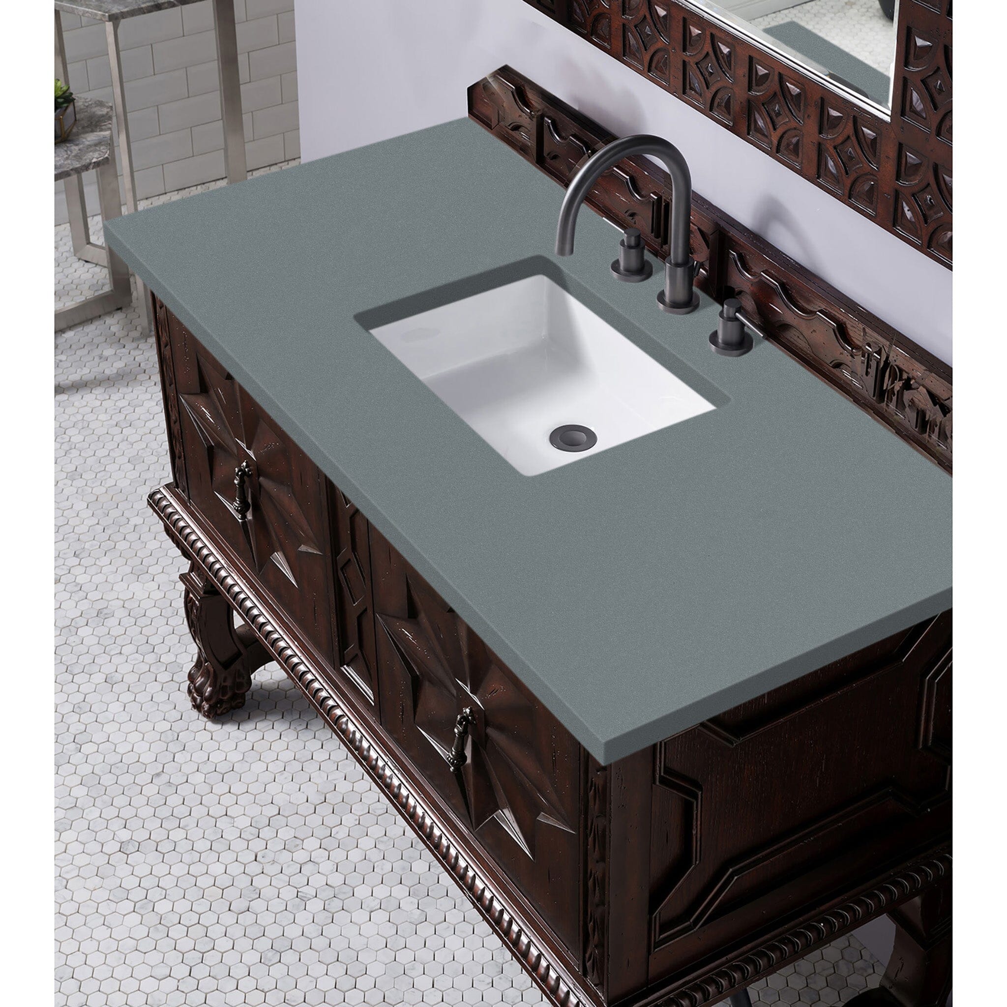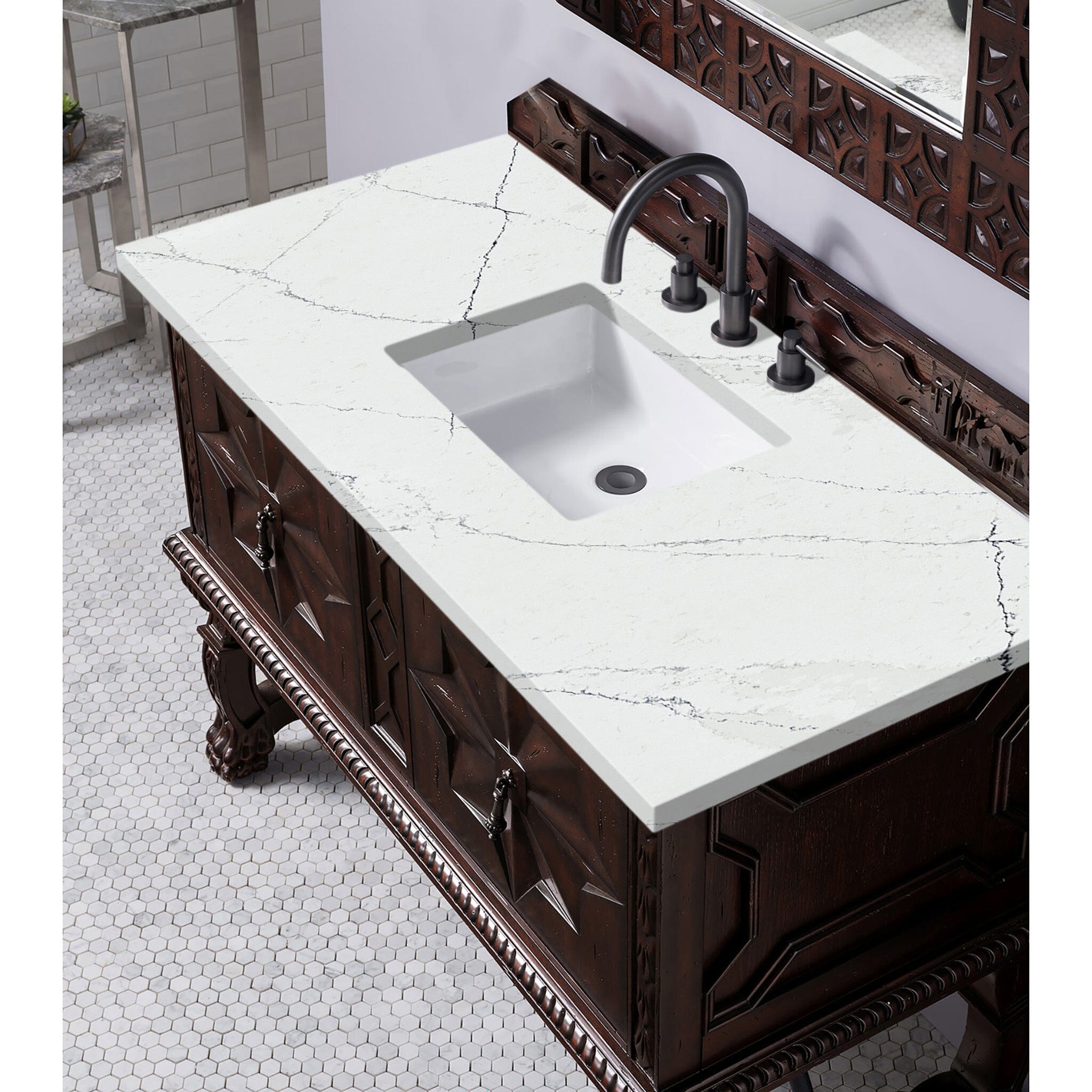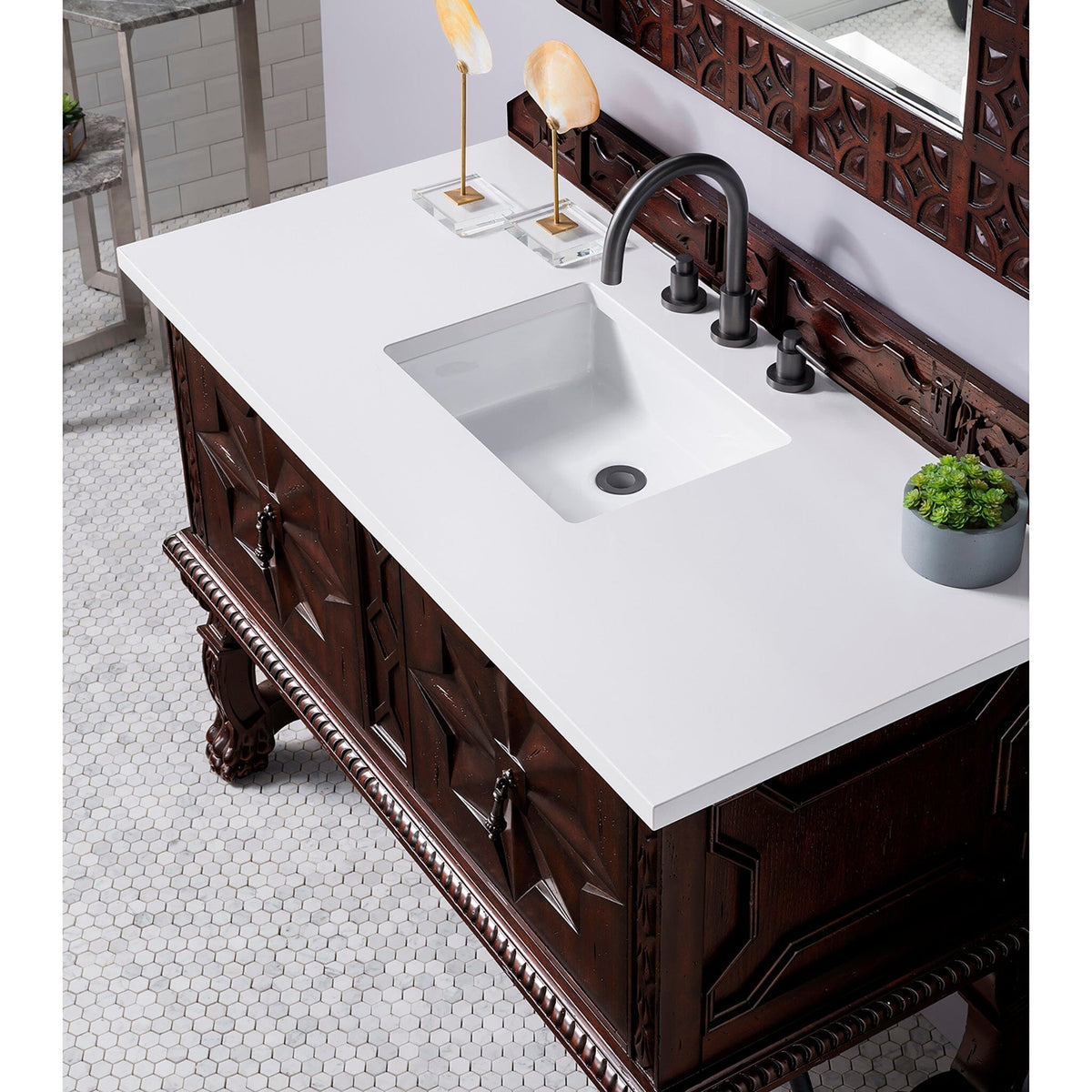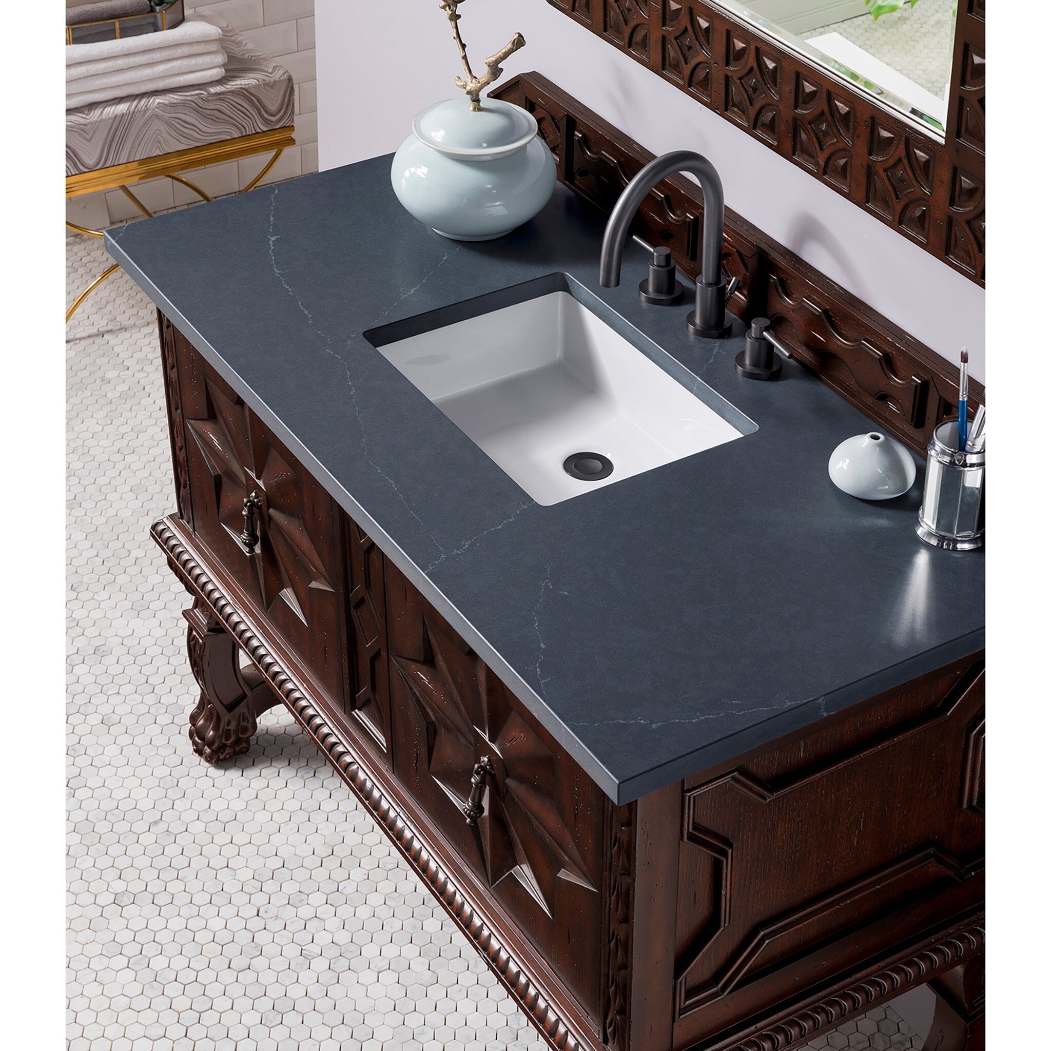 The Balmoral 48" Antique Walnut vanity by James Martin Vanities features hand-carved details, from the cabinet feet all the way through the doors. The beautiful decorative Iron scrollwork accents this piece which includes two doors with open storage space. Antique pewter finished door pulls complete the look. Each cabinet is configured to work with our variety of either 2cm, 3cm, or a 4 cm countertops. The matching decorative wood backsplash is included.