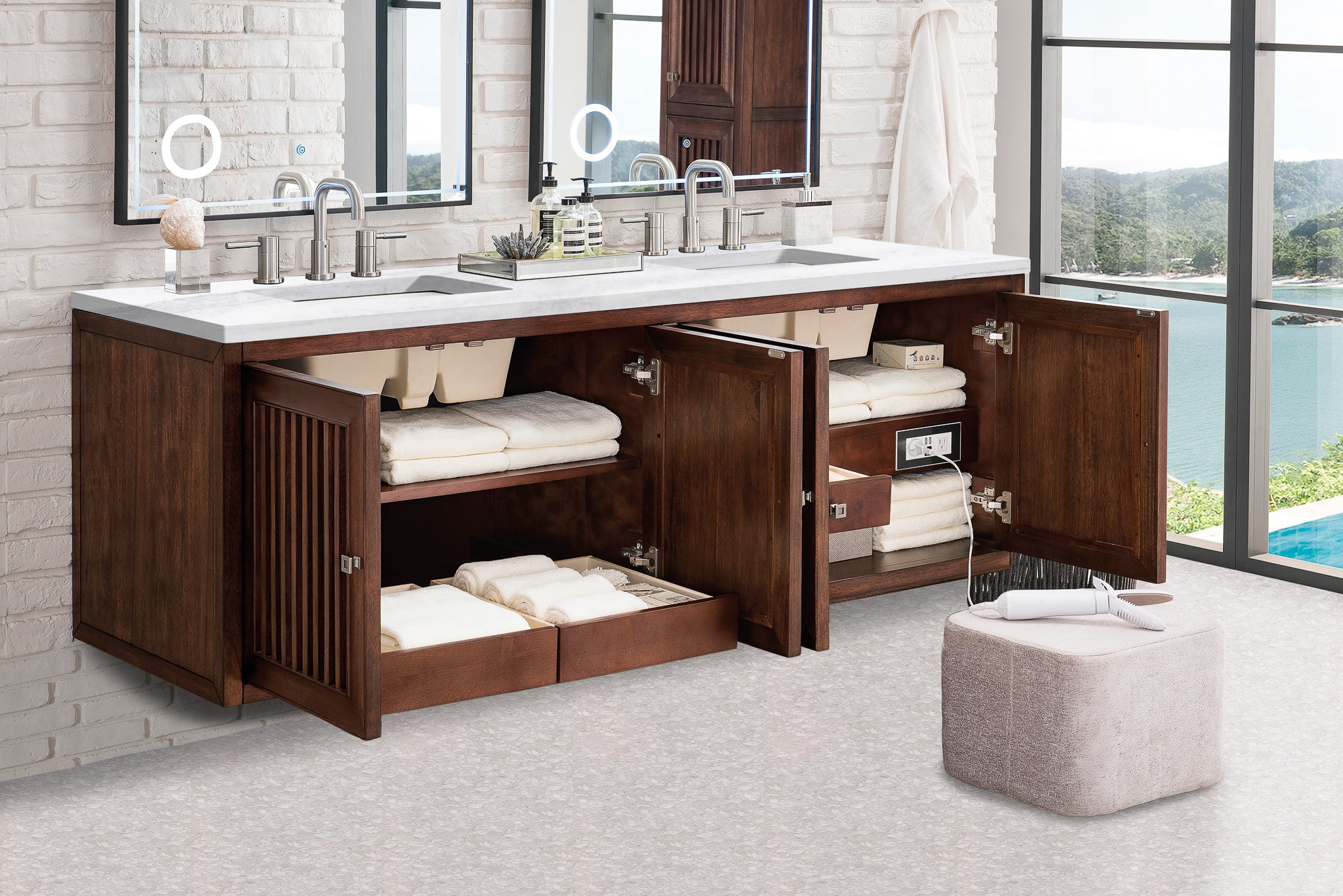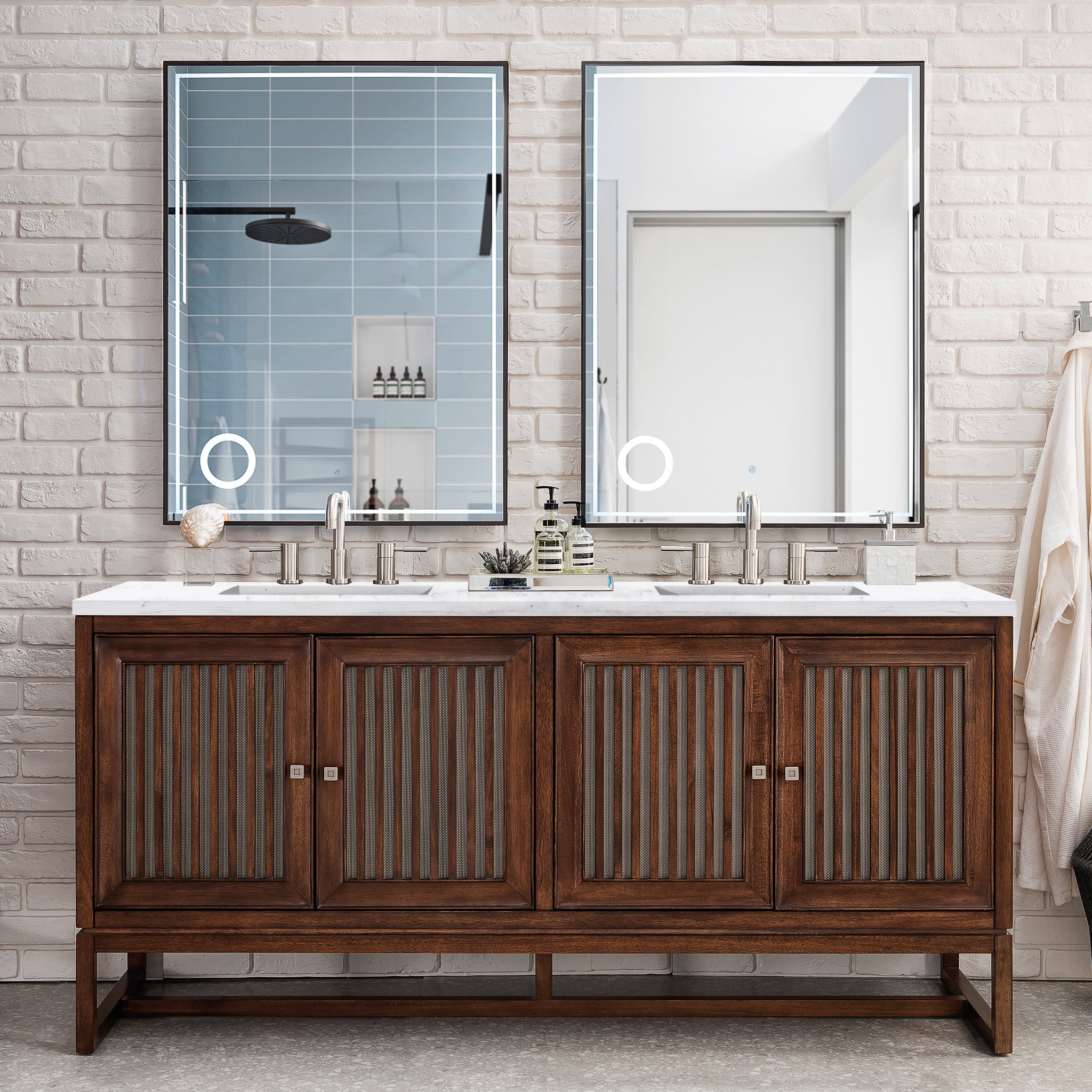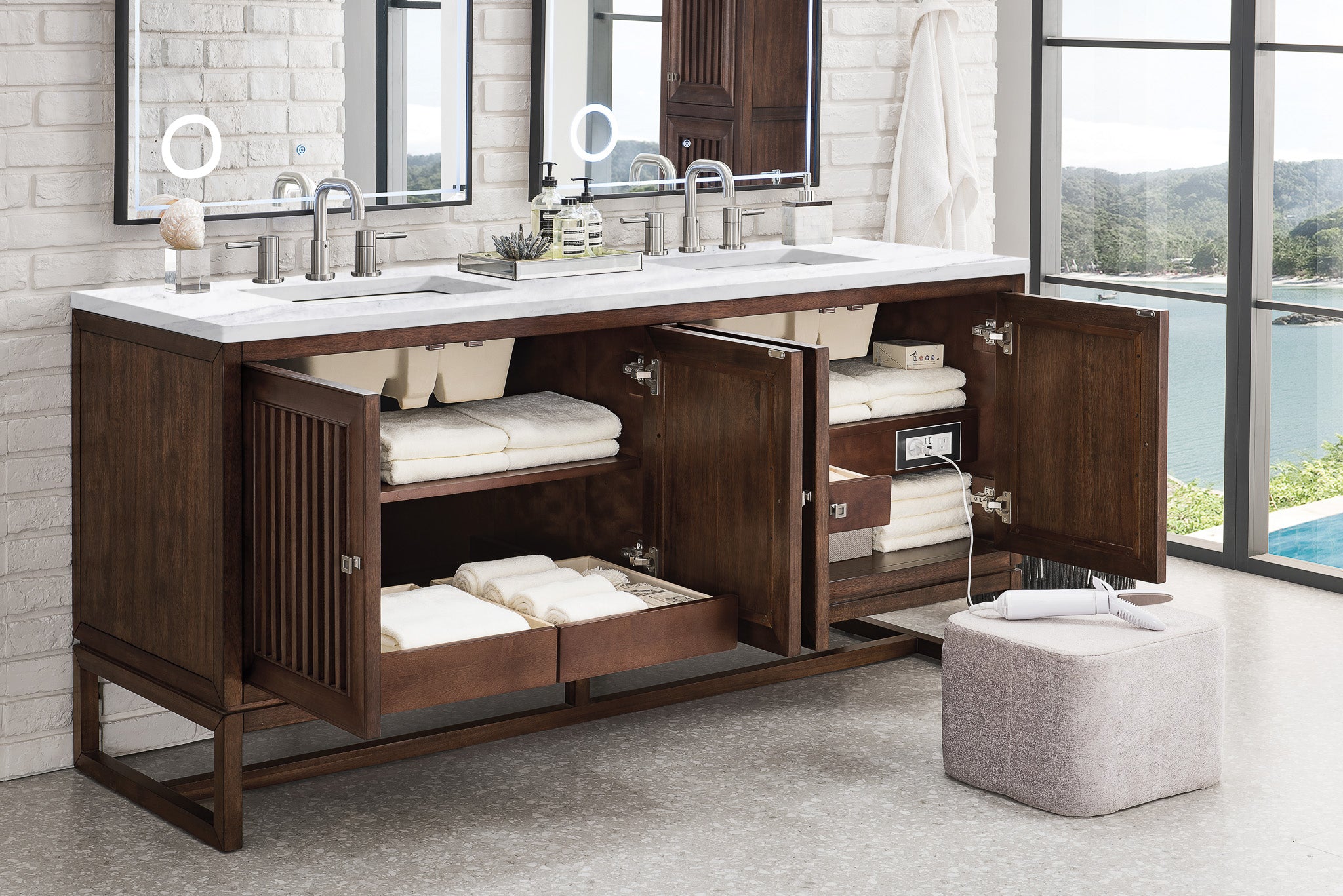 72" Athens Double Bathroom Vanity, Mid-Century Acacia w/ Arctic Fall Top