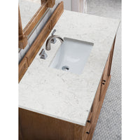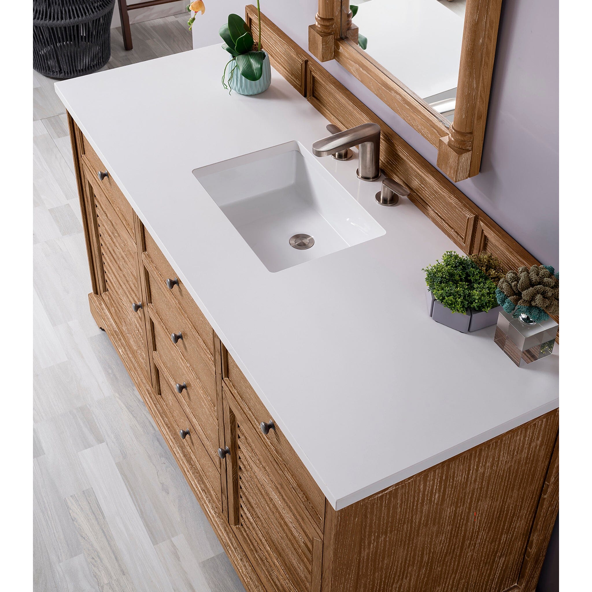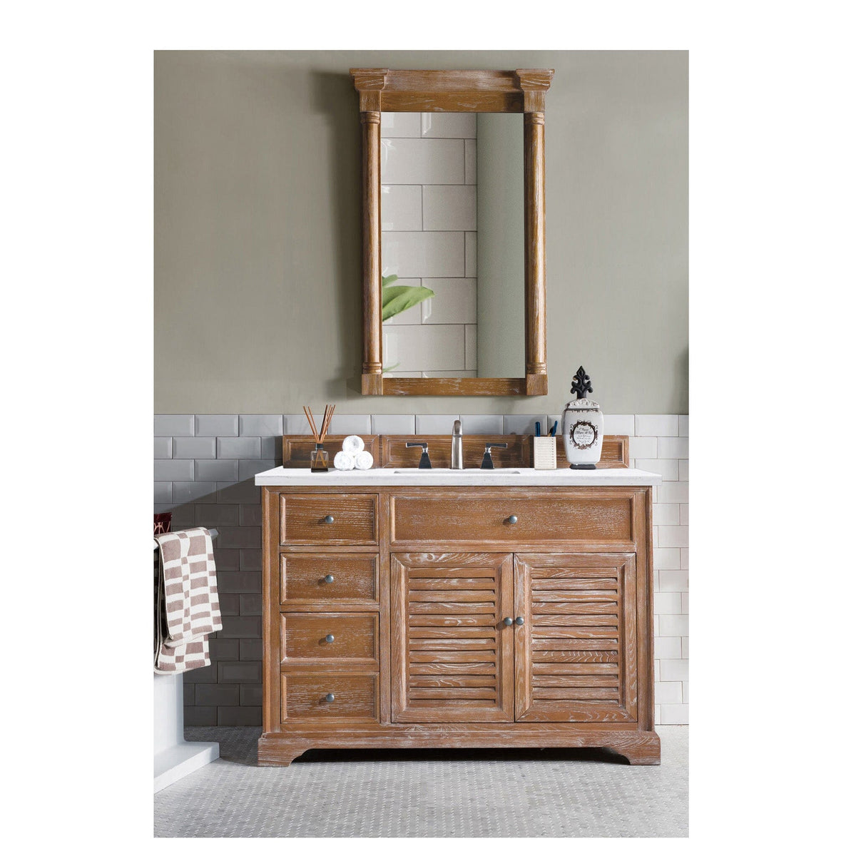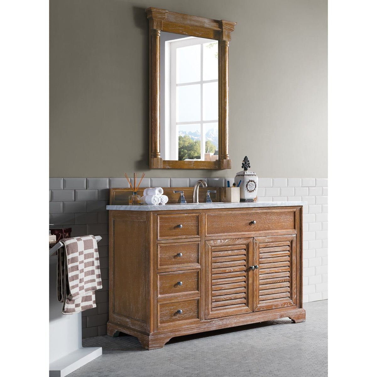 The Savannah 48" Driftwood vanity by James Martin Vanities features a Savannah Shutter take that can take you anywhere. From the beach, to the cottage, to the cabin you will feel at home with this beautifully hand crafted piece of furniture as the focal point in your bathroom. Pewter finish door and drawer pulls adorn two doors, with shelves for storage, and two drawers, with the bottom drawer being double height for taller items. Top two drawers are "false drawers" to allow for sink placement.